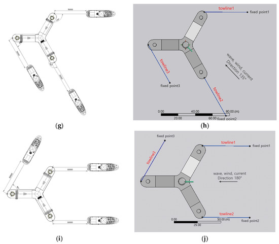 In this study, five environmental load directions (0°, 45°, 90°, 135°, and 180°) were considered to examine the tugboat arrangements and the behavior of the installation system. The tugboat arrangements and an overview of the analysis model for each direction are presented in Figure 7. This configuration reflects the fact that waves, wind, and current can act from various directions in offshore conditions, and the five representative directions were analyzed to evaluate the tugboat positions and towline connections.