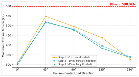 In this study, numerical analyses were performed for three stages corresponding to different spudcan penetration depths: Step 1 (–5 m, non-flooded), Step 2 (–10 m, partially flooded), and Step 3 (–15 m, fully flooded), and the results were compared and analyzed. Figure 8 summarizes the maximum towline tensions for each stage with respect to the environmental load directions, with the BPeff of the tugboat fleet (=598 kN) indicated as a reference.