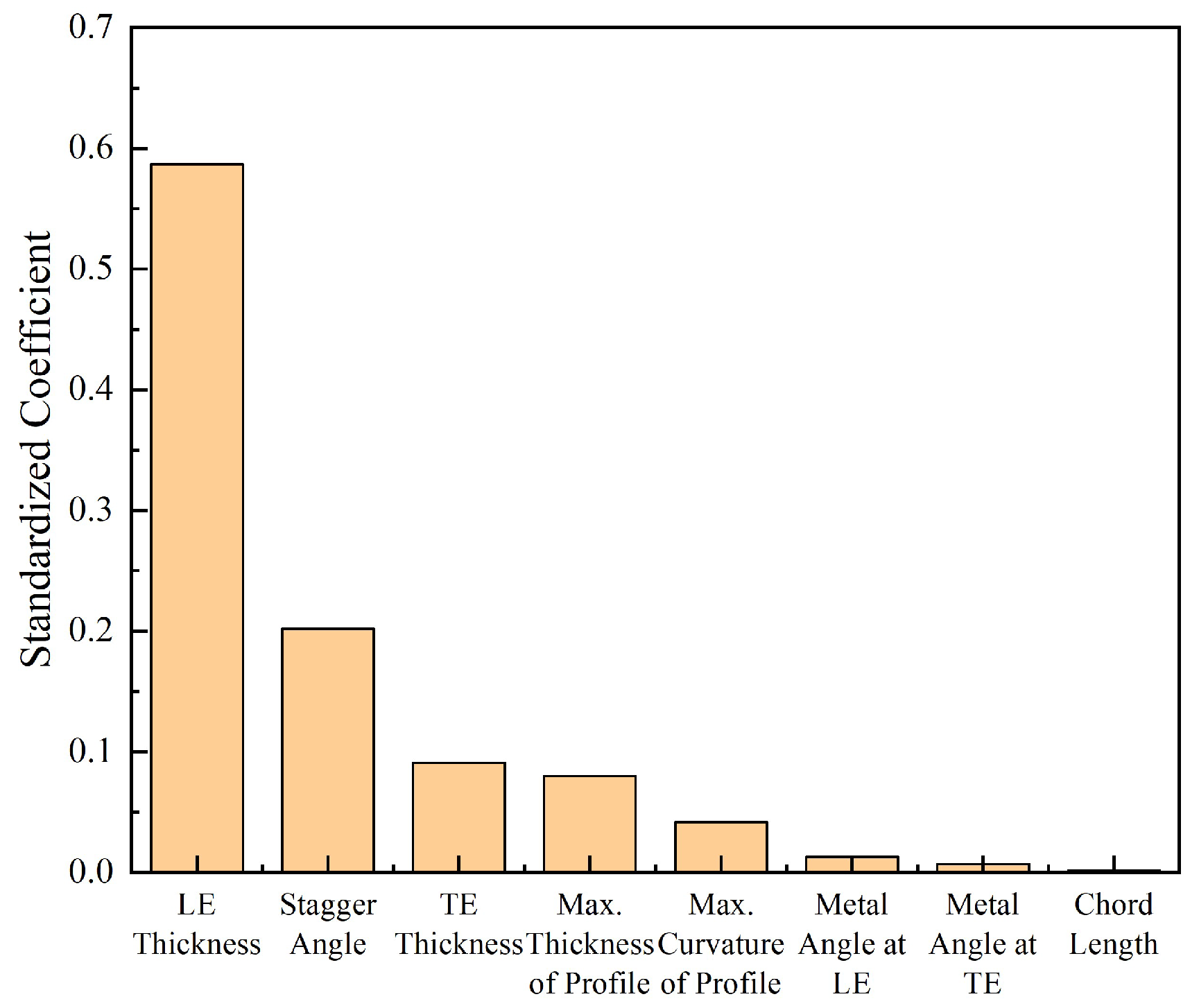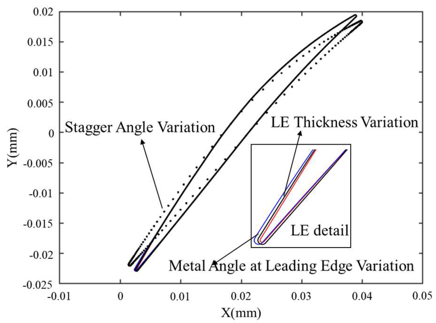 19] implemented a data-driven polynomial chaos approach combined with kernel density estimation to systematically quantify the effects of multiple geometric deviations. Their findings indicated that various geometric deviations at the 50% span section, as well as deviations in the LE radius and stagger angle at the 95% span section, significantly influence flow field losses. Additionally, Zheng et al. [