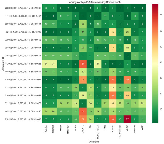 The diverse set of fourteen MCDM algorithms was selected to capture the range of ranking behaviors encountered in engine optimization tasks.