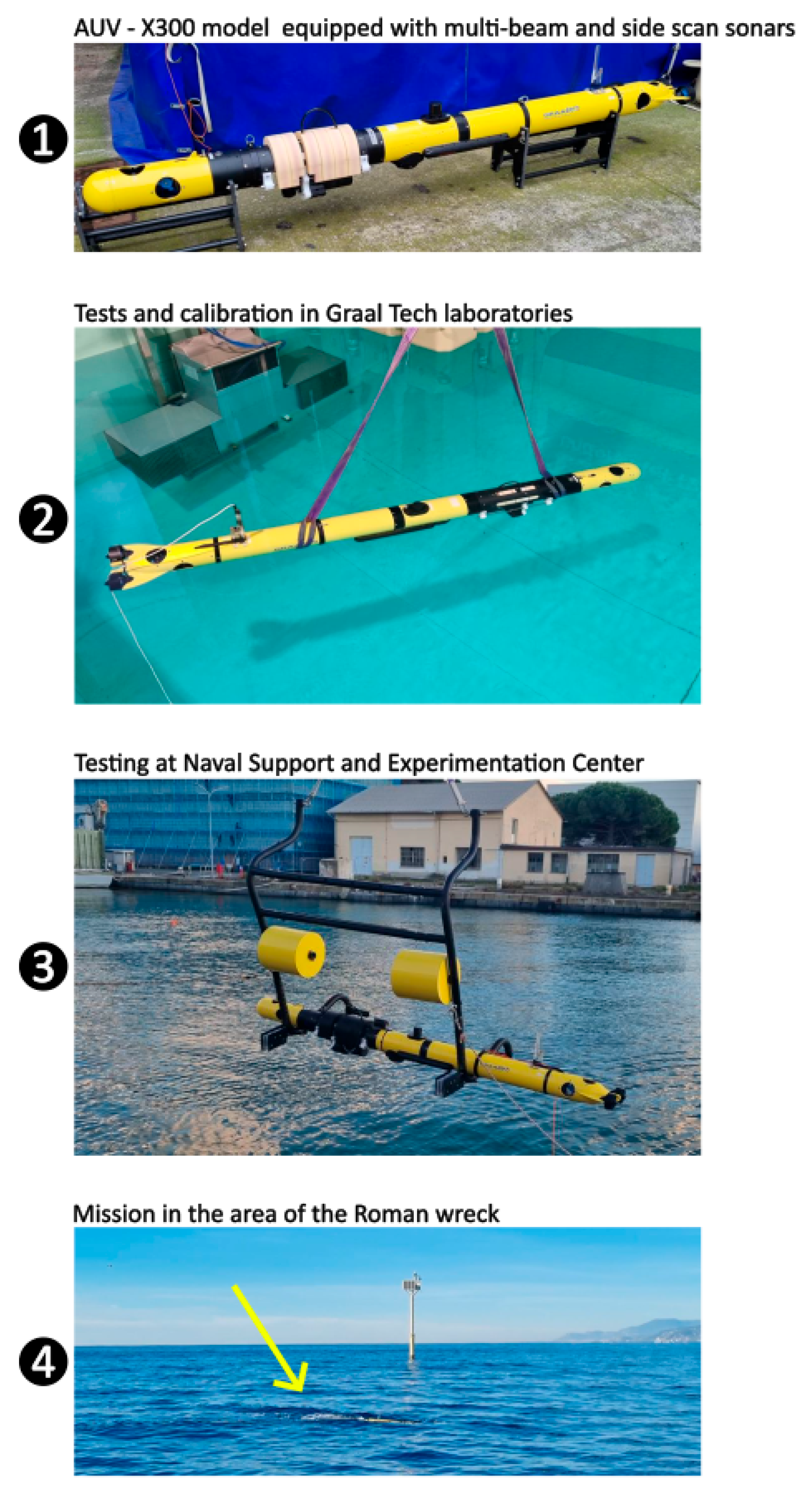 In the present study, an AUV assembled by Graal Tech was deployed for the inspection of the Roman shipwreck off the coast of Santo Stefano al Mare, at a depth of approximately 58 m. The employed platform was based on the X300 model, equipped with instruments for high-resolution bathymetric mapping and imaging and georeferenced localization of the AUV.