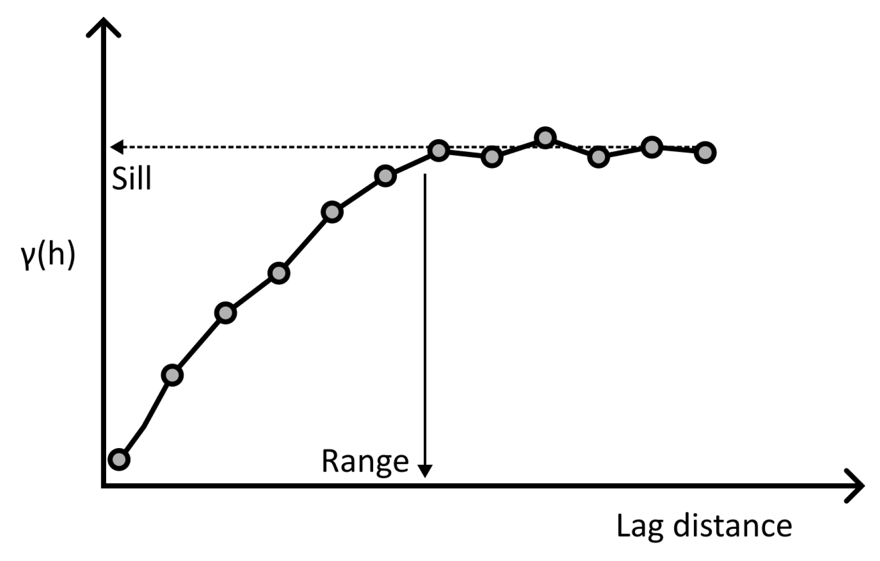 During the variogram analysis, the values of the variogram are plotted for several lag distances. If the dataset shows correlation in a specific direction, it is expected that the variogram values will flatten out, at a certain distance, when the maximum data variability (sill) is reached. This lag distance is called range and indicates the maximum distance, in a given direction, for which the values remain correlated. To evaluate the full spatial correlation, the variogram can also be calculated for different directions, investigating the presence of anisotropy effects. If the dataset exhibits higher spatial continuity in a certain direction, a longer correlation range is expected in that direction. In several cases, the dataset may be characterized by the presence of a trend; in such cases, the variogram analysis will show a continuous increase with larger lag distances never reaching the “sill” point.
