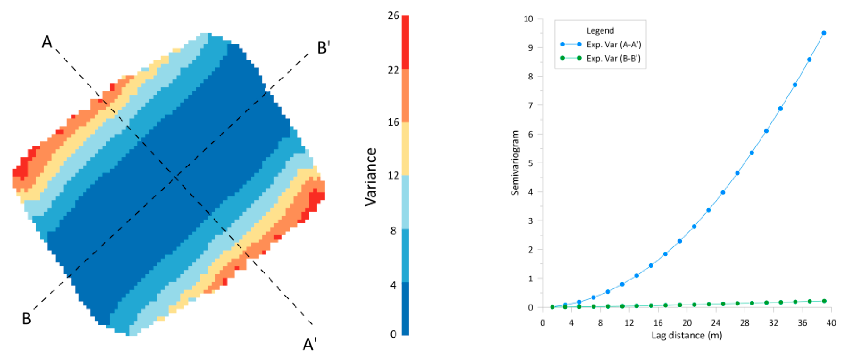 37]) was performed in order to identify the spatial characteristics of the dataset (including spatial variation or degree of discontinuity). For this reason, it was necessary to calculate the variogram, a useful tool to identify various spatial features of a dataset, such as spatial continuity, cyclicity, or trend. For observations collected in nature (data points within a specific area), the variogram (or semi-variogram) is defined as the half variance of two observations that are separated in space by a specific distance (lag distance). In this case, the experimental variogram was calculated as follows: