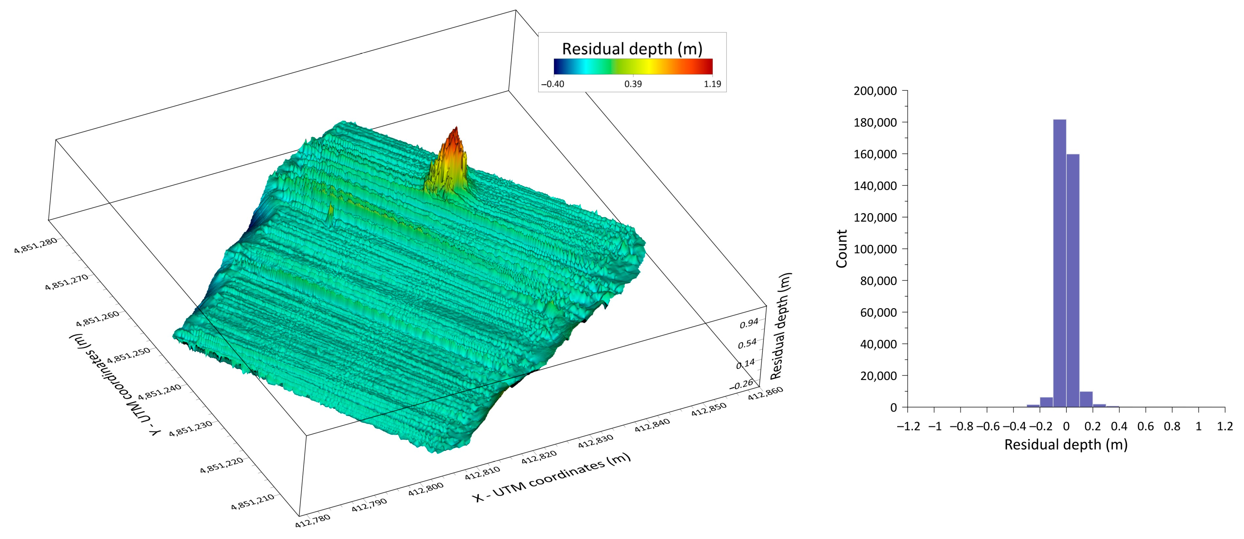 This trend was subsequently subtracted from the data points to create a detrended dataset of the bathymetric data suitable for further analysis. The detrended data, interpolated using the Kriging interpolation technique, along with the corresponding histogram distribution of the residual depth values, are presented in
