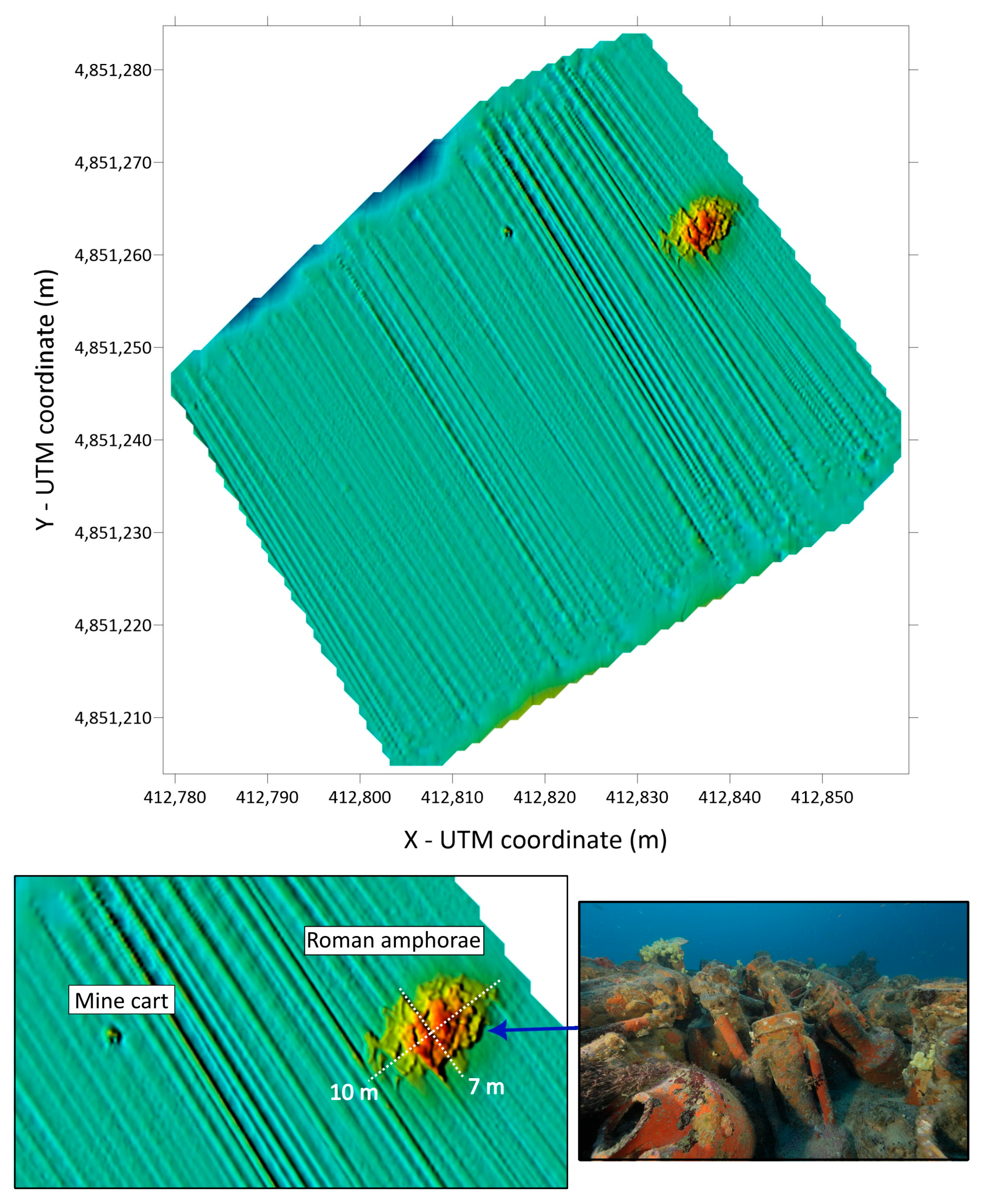 Figure 11. The first anomaly of large dimensions corresponds to the Roman shipwreck site. It covers an area of approximately 10 m × 7 m and highlights the accumulation of amphorae related to the cargo of the Roman ship that sank in that region. The maximum height of the amphorae accumulation reaches almost 1 m. The second anomaly has dimensions of approximately 1.5 m × 1.5 m and corresponds to a mine cart.