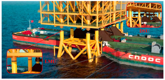 The docking slow collision system includes the DSU and LMU, as shown in Figure 1. The DSU is located on the deck of the floating barge, which buffers the vertical collision load between the upper block and the floating barge during the weight transfer of the upper block. The LMU is located at the top of the jacket leg and buffers the horizontal and vertical collision loads generated between the upper block and the jacket during the weight transfer of the upper block.