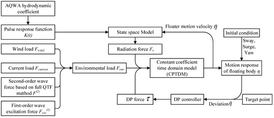 To solve the motion of the floating body in the DP state, it is necessary to input the OBRC-CPTDM model to input the target point and the initial conditions of the time-domain model, that is, the displacement and velocity of the floating body at the moment. Subsequently, the CPTDM performs time stepping, outputs the floating body motion response and inputs the deviation for the OBRC, and the OBRC outputs the DP force as the external load input of the CPTDM in the next time step. The overall process of OBRC-CPTDM is shown in Figure 3. For the verification and comparison of CPTDM’s own performance with AQWA, FAST and other software, we can refer to the study carried out by Zou et al. [17].