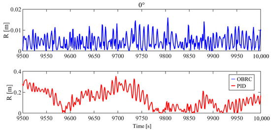 The time history curve of the offset radius of the T-U barge under different wave incident angles and different controllers is shown in Figure 4, Figure 5, Figure 6, Figure 7 and Figure 8. It can be seen from the diagram that under the control of the PID model, the barge oscillates around the target point, and its oscillation period is determined by the proportional coefficient It can be considered that the equivalent natural period of the PID model in this oscillation period is about 200 s. When the external load is a constant load, the object controlled by the PID model will converge to the target point.