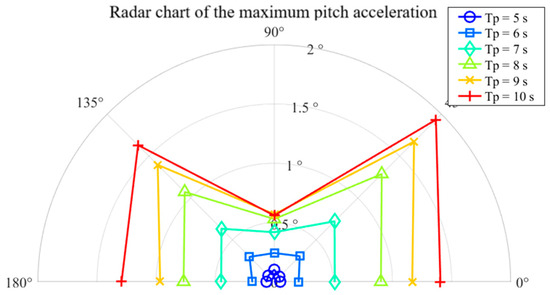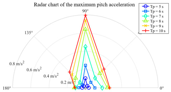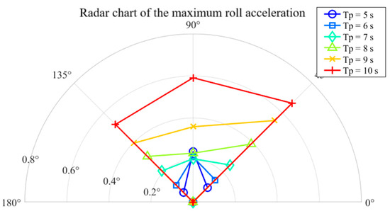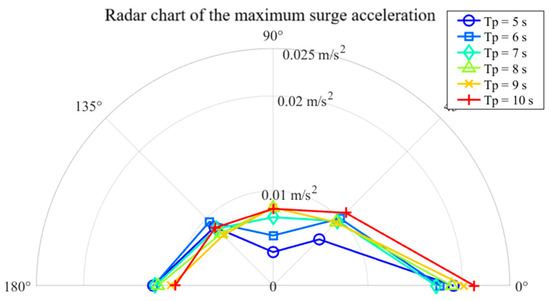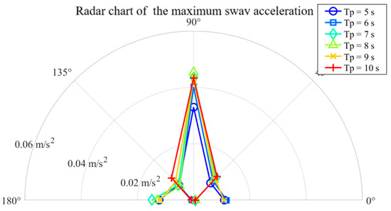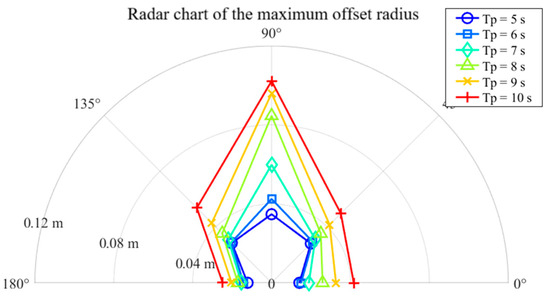 Figure 9, Figure 10, Figure 11, Figure 12, Figure 13 and Figure 14 present polar plots of the maximum surge, sway, and heave accelerations, maximum roll and pitch amplitudes, and maximum offset radius of the barge during the standby phase under various wave directions and spectral peak periods. As shown in Figure 9, the maximum surge acceleration under following sea conditions is notably higher than under other wave directions; nevertheless, the overall values remain well below the operational limit of 0.1 g. Figure 10 illustrates that the maximum sway acceleration occurs under beam sea conditions. Aside from head and following seas, sway accelerations show limited variation across wave directions and do not exceed the 0.1 g threshold. Regarding heave motion (Figure 11), the heave acceleration increases with wave period and is generally greater than that under head sea conditions. At a spectral peak period Tp = 10 s, the heave acceleration reaches approximately 0.8 m/s2, approaching the specified limit of 0.1 g.