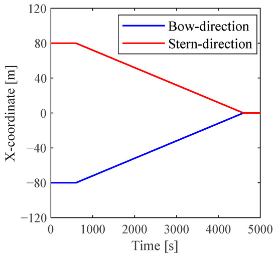 When using the PID controller, it is first necessary to determine the three gain values of the proportional coefficient , the integral coefficient and the differential coefficient . Referring to the PID parameters of the float-over barge HYSY278 proposed by Zhang [3] and after debugging according to the characteristics of the T-U barge, the proportional coefficient , integral coefficient and differential coefficient were taken. The target position was set at the barge’s center of gravity.