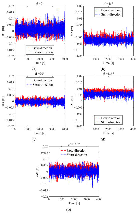 On the other hand, in Figure 19c, it can be seen that the maximum heading angle of the ship’s bow entry is largest under the 45° wave direction, followed by 90° and 135° again, and there is almost no response under the 0° and 180° wave directions. When the ship enters the stern, the 90° wave direction is the largest, followed by 45° and 135° again. In the 90° wave direction, the maximum amplitude of the heading angle when the stern enters the ship is larger than that when the bow enters the ship, while in the 45° and 135° wave directions, it is the opposite, and it is smaller when the stern enters the ship. The RMSE of the heading angle is shown in Figure 19d. Under both conditions, the RMSE of the 45° wave direction is the largest, and it is much larger than under other wave directions and is followed by the 90° wave direction, 135° again, and the 0° and 180° wave directions, which are the smallest. The heading angle RMSE when the bow enters the ship at 45° and 90° are larger than those when the stern enters the ship, and vice versa, at 135°.