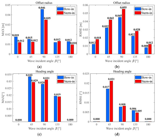 In order to measure the fluctuation of the deviation between the actual position of the barge in the dynamic path and the set path, the root mean squared error (RMSE) is introduced. The statistical values of the deviation radius of the actual position of the barge relative to the set path and the deviation of the heading angle under two working conditions are given in Figure 19. It can be seen from Figure 19a that the maximum offset radius of the barge in the process of entering the ship is much larger than the other four wave directions in the 90° wave direction. In 0°, 45°, 90° and 180° waves, the offset radius of the stern is larger than that of the bow, and only the offset radius of 135° waves is smaller. In contrast, as shown in Figure 19b, the RMSE of the offset radius is greatest under 90° wave incidence, followed by 45° and 135° directions, and smallest under 0° and 180° directions. No significant differences are observed in the RMSE among the 0°, 90°, and 180° wave conditions. At 45°, the offset radius RMSE of the stern entry condition is larger than that of the bow entry condition. On the contrary, at 135°, the offset radius RMSE of the stern entry condition is smaller than that of the bow entry condition.
