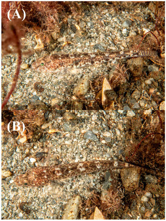 Example of the original underwater photographs of Pomatoschistus minutus. PMR VP5410, adult male, 46.8 + 10.1 mm, Breivika, Hundvaag, Norway, Area B, medium to coarse sand with scattered brownish algae biocover, 18 November 2022. (A) Lateral side. (B) Dorsal side. Photos by R. Svensen.