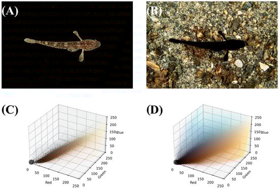 Example of (A) the body and the background mask used to separate fish body on underwater photographs of Pomatoschistus minutus from the background and (B) vice versa. Example of 3D color histogram of (C) the fish body and (D) the background on photographs of Pomatoschistus minutus.