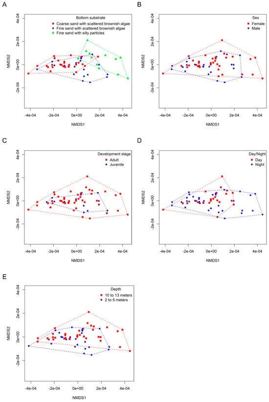 Non-metric multi-dimensional scaling (nMDS) ordination plot comparing body coloration of dorsal side photographs for (A) Bottom substrate, (B) Sex, (C) Developmental stage, (D) Time of day, and (E) Depth, with levels explained in graphs.