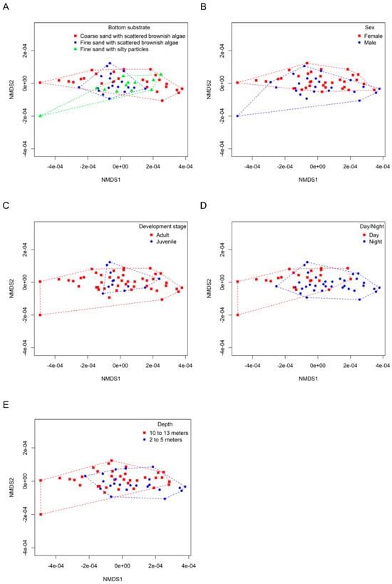 A one-way PERMANOVA on the quantified dissimilarities in lateral body coloration indicated a significant difference among bottom substrates, but no significant difference for the factors of Sex, Developmental stage, Time of day, or Depth (Table 3). For the bottom substrates, PERMDISP indicated that group dispersions were homogeneous (F2 = 0.218, p = 0.805), suggesting that the significant bottom substrate effect reflects differences in centroids rather than dispersion. Pairwise comparisons confirmed that each substrate type had significantly different lateral body coloration from the other two. nMDS plots effectively illustrated this body coloration differentiation among bottom substrates (Figure 3A), but not for other factors (Figure 3B–E). nMDS plot (Figure 3A) showed a larger separation of convex hulls among bottom substrates, especially between Fine sand with silty particles and the other two bottom substrates. An additional PERMANOVA for the combined factor of sex and developmental stage on the same substrate (Areas A and D) again showed no significant differences in lateral body coloration among groups (Table 3).