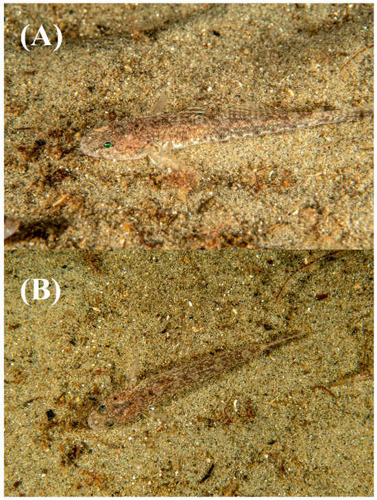 Example of the original underwater photographs of Pomatoschistus minutus. PMR VP5405, adult male, 45.2 + 9.9 mm, Breivika, Hundvaag, Norway, Area A, Fine sand with scattered brownish algae biocover, 18 November 2022. (A) lateral side. (B) dorsal side. Photos by R. Svensen.