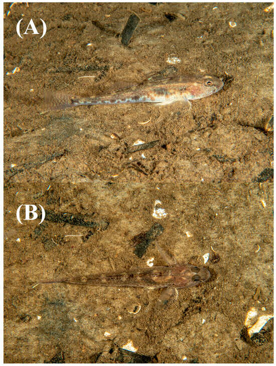 Example of the original underwater photographs of Pomatoschistus minutus. PMR VP5585, adult female, 56.2 + 9.9 mm, Breivika, Hundvaag, Norway, Area E, the Fine sand with silty particles, 5 January 2023. (A) Lateral side. (B) Dorsal side. Photos by R. Svensen.
