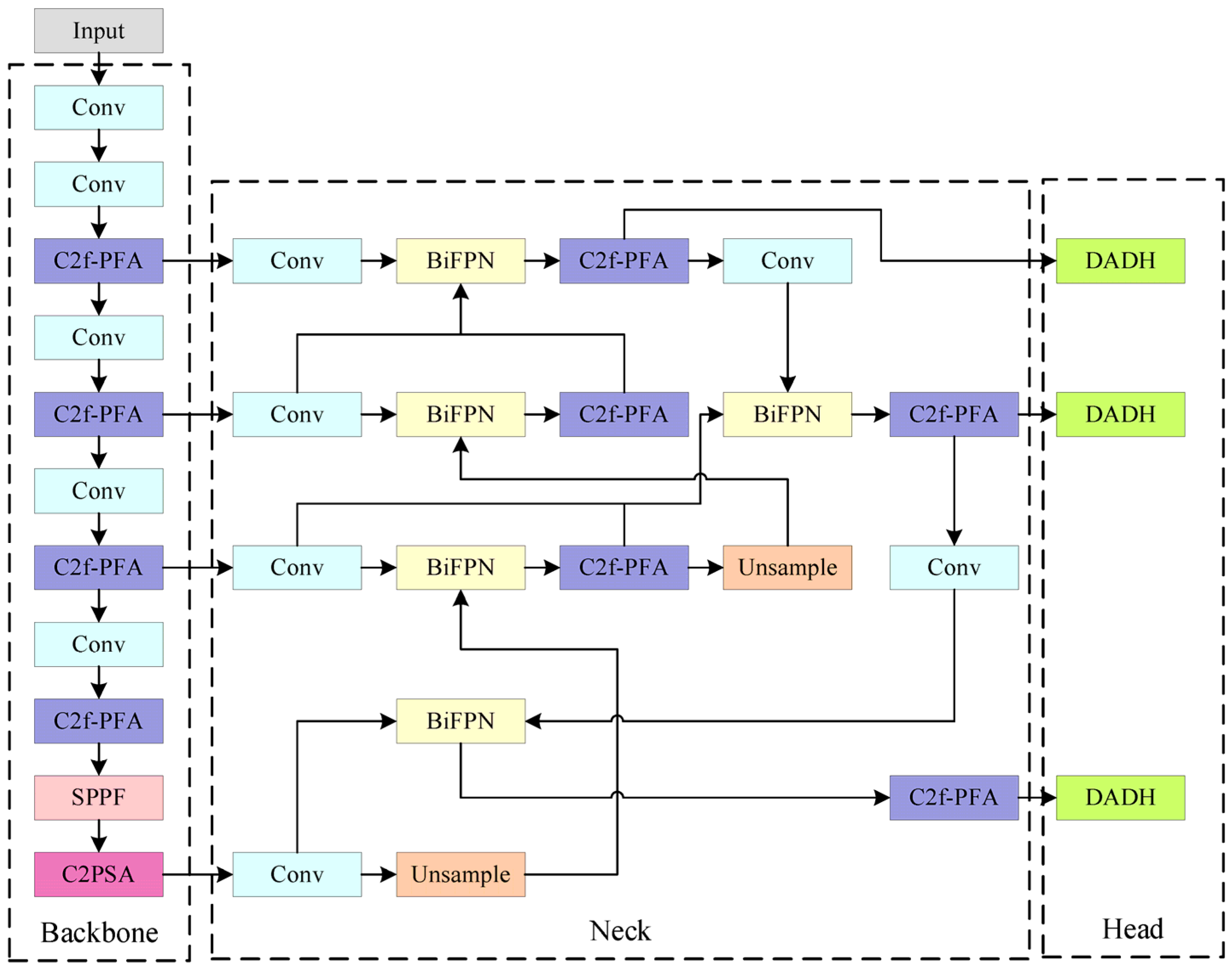 - To address the limitations of YOLOv11 in managing targets of varying scales—such as inefficient multi-scale feature fusion, inadequate adaptive balancing of cross-layer feature contributions, and suboptimal detection of small objects—this study incorporates the Bidirectional Feature Pyramid Network (BiFPN) [22]. BiFPN utilizes bidirectional connections to facilitate efficient information flow across multi-resolution feature maps, along with an adaptive weighting strategy that dynamically prioritizes salient features, thereby enhancing multi-scale fusion. These mechanisms significantly improve the capture of details for small objects, ultimately leading to enhanced detection accuracy and robustness for YOLOv11.