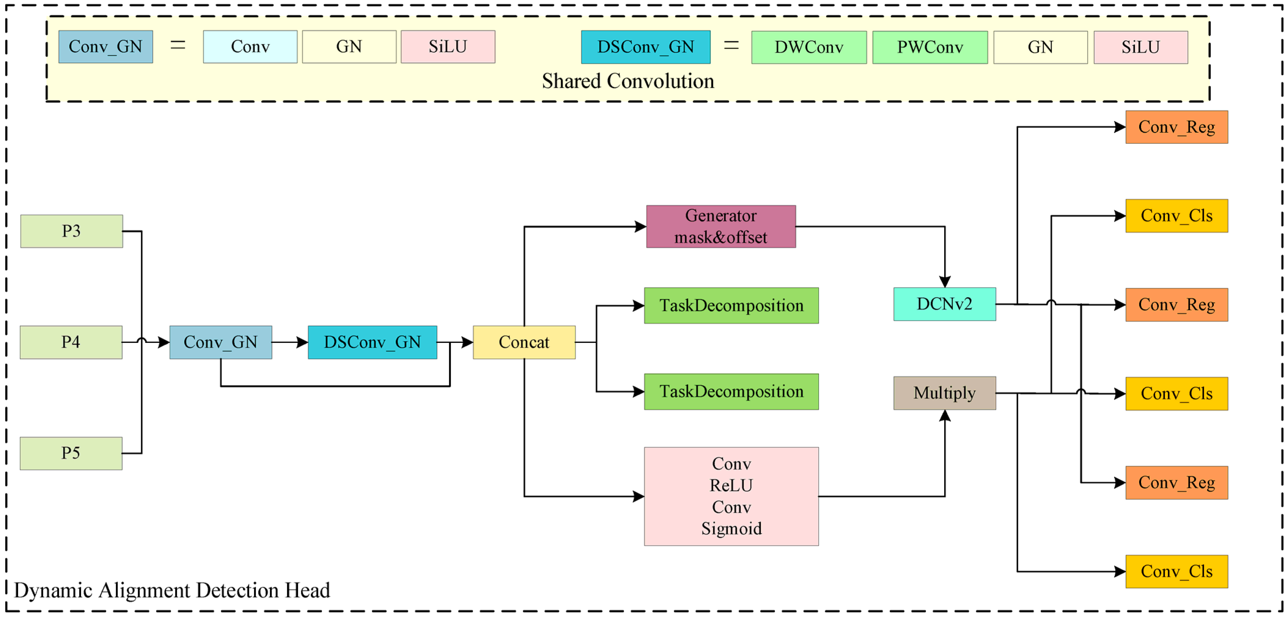 - To resolve the issue in ship detection where misalignment between classification and localization tasks makes their joint optimization difficult, this study integrates Depthwise Separable Convolution with Group Normalization (DSConv_GN) into the Task-aligned Dynamic Detection Head (TADDH) [23], proposing an enhanced Dynamic Alignment Detection Head (DADH). This module dynamically selects discriminative features critical for both tasks in complex marine scenarios, thereby improving detection accuracy across ship types and scales. Additionally, DSConv_GN mitigates overfitting and reduces computational overhead.