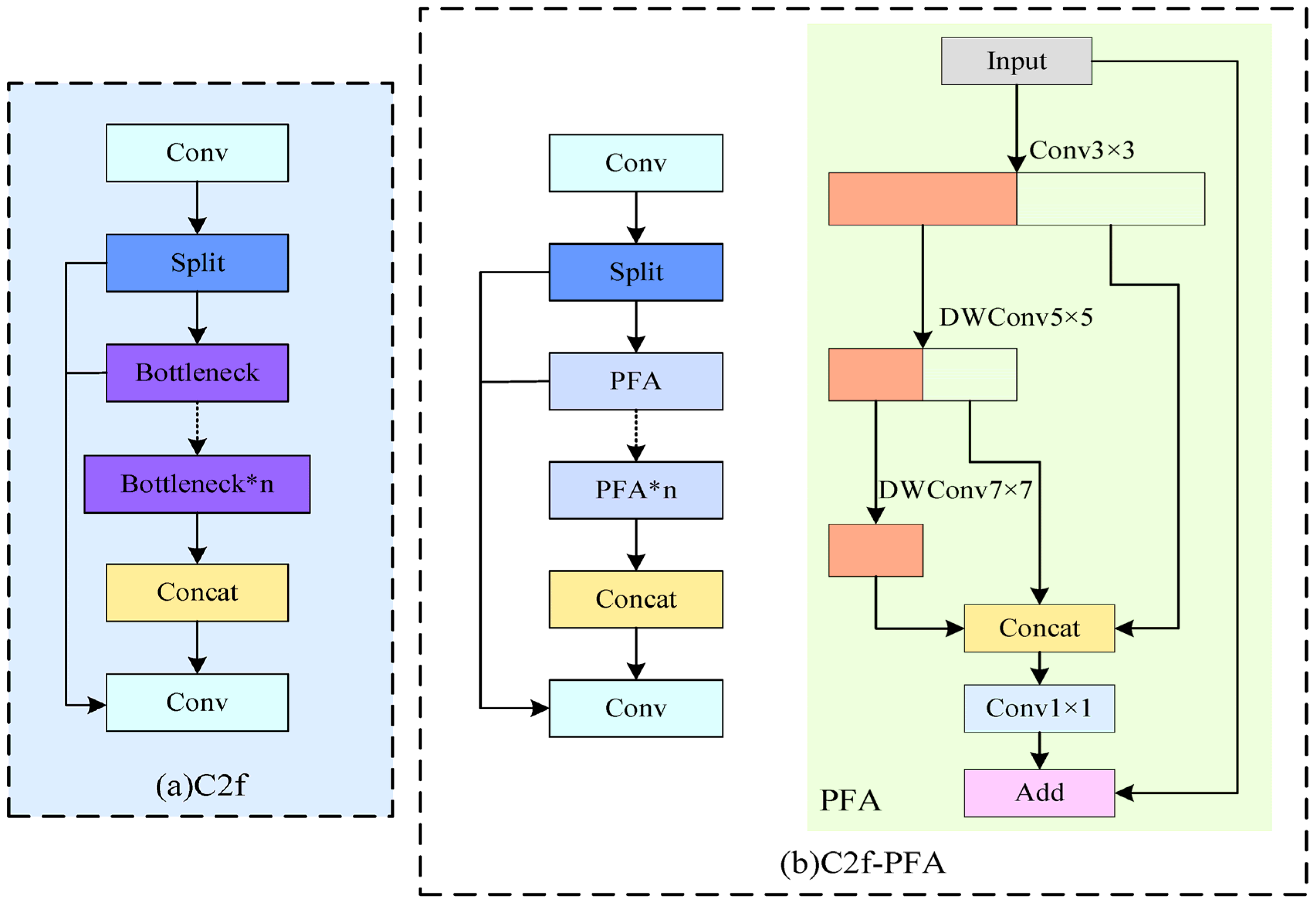 - To address low detection accuracy caused by large-scale variations and heavy background clutter in ship detection, the C2f-Partial Feature Aggregation (C2f-PFA) module is proposed. It extracts multi-scale features via varied convolutional kernels and fuses raw and processed multi-scale features to strengthen comprehensive ship feature expression. Integrating 1 × 1 convolution and residual connections further refines key features, reduces information loss, and alleviates gradient vanishing.