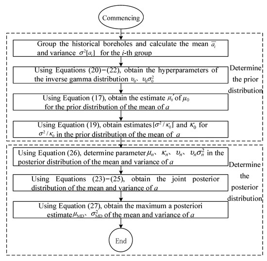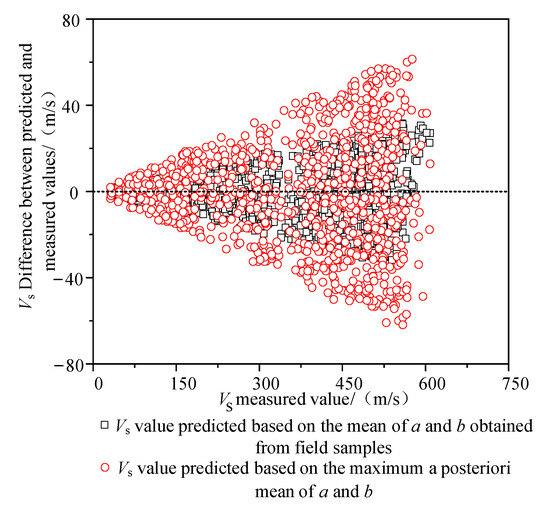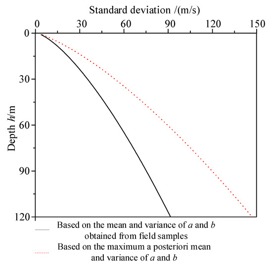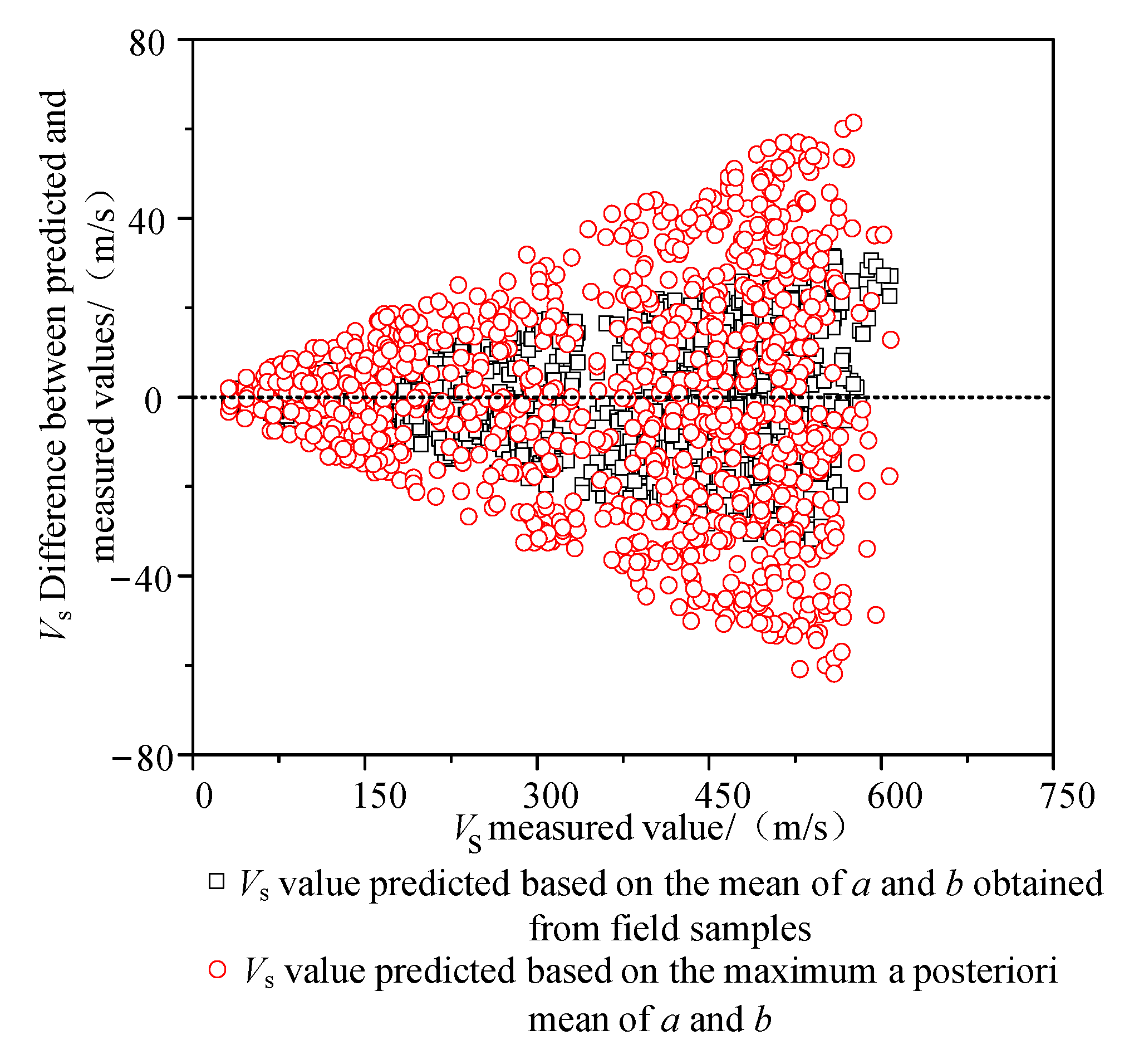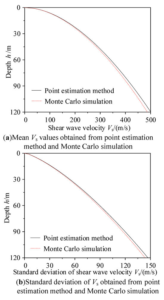 - The posterior distributions of the mean and variance for a and b were obtained by combining their prior distributions with on-site sample data. Using the maximum posterior mean of a and b with the point estimation method, the variation in the mean and standard deviation of predicted Vs values with h (when using the power function) was derived. The accuracy of the point estimation method results was validated via Monte Carlo simulation.
