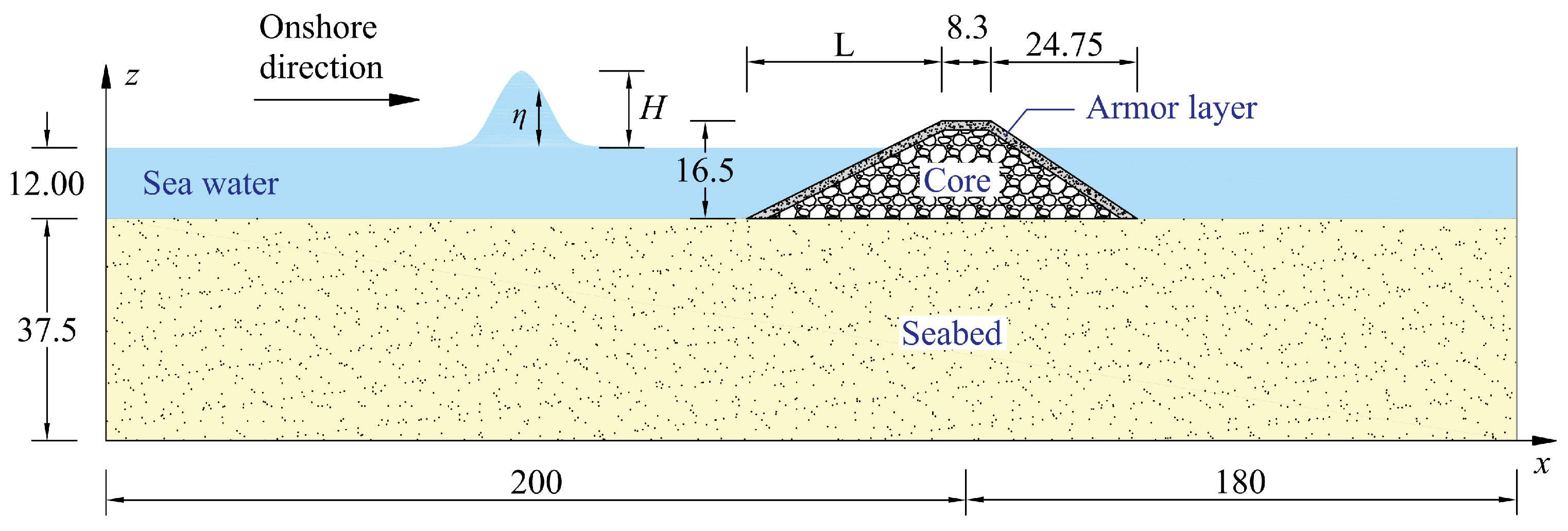 To achieve this, a comprehensive numerical model of the wave–seabed–breakwater system is established. It is crucial to note that this study focuses specifically on the geotechnical stability (i.e., shear failure and sliding) of the breakwater core and its foundation under wave-induced loading. The armor layer is simplified as a porous continuum for the purpose of pressure transmission. Consequently, the well-established hydraulic failure modes of rubble mound breakwaters, such as the displacement and erosion of individual armor units, are not simulated in this model. Hudson-type formulae have been developed which describe the stability of breakwater armor layers under wave attack [