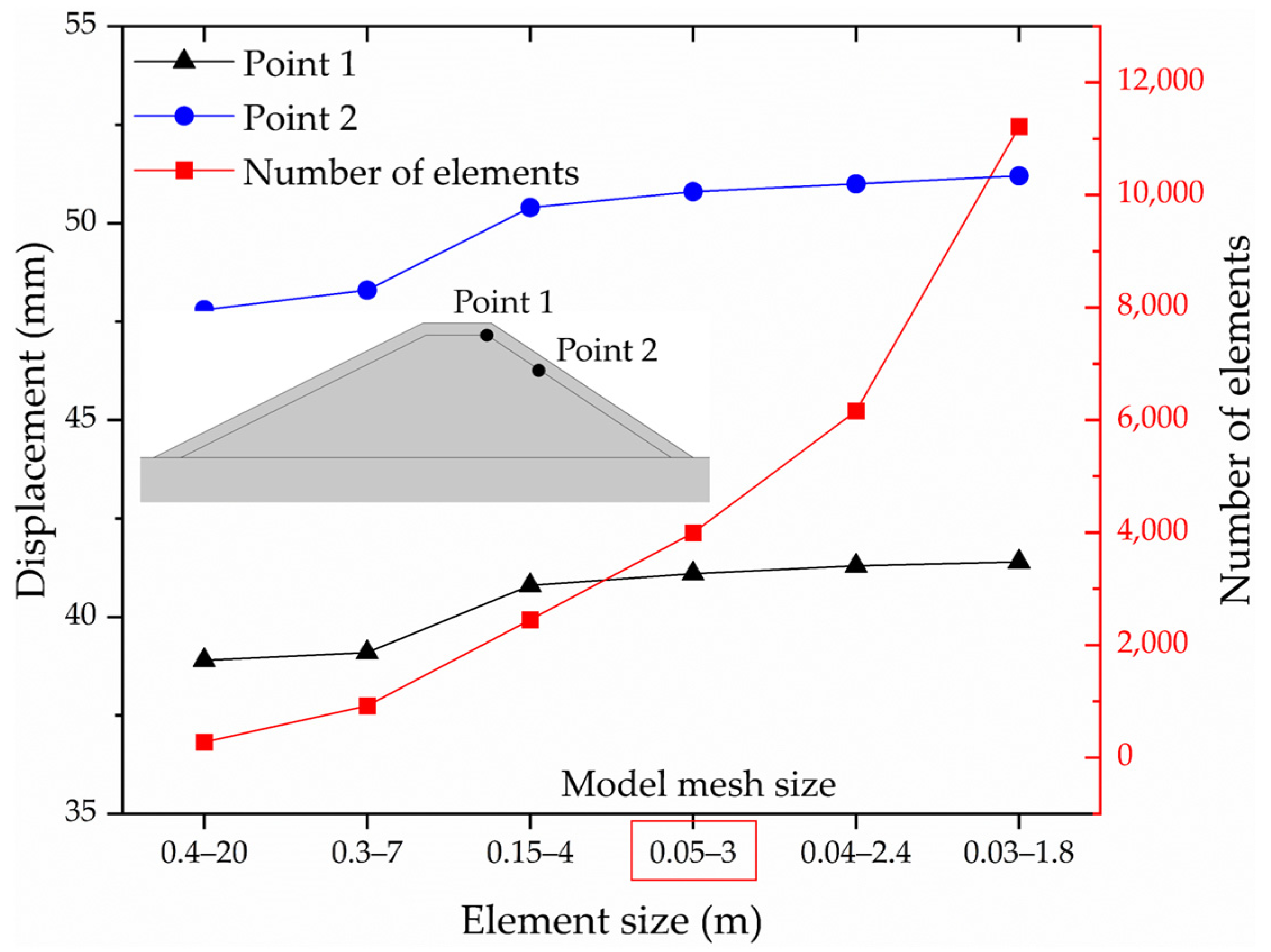 A mesh sensitivity analysis is conducted for the seabed model to ensure the reliability of the numerical results. The displacements at two specific points on the breakwater at