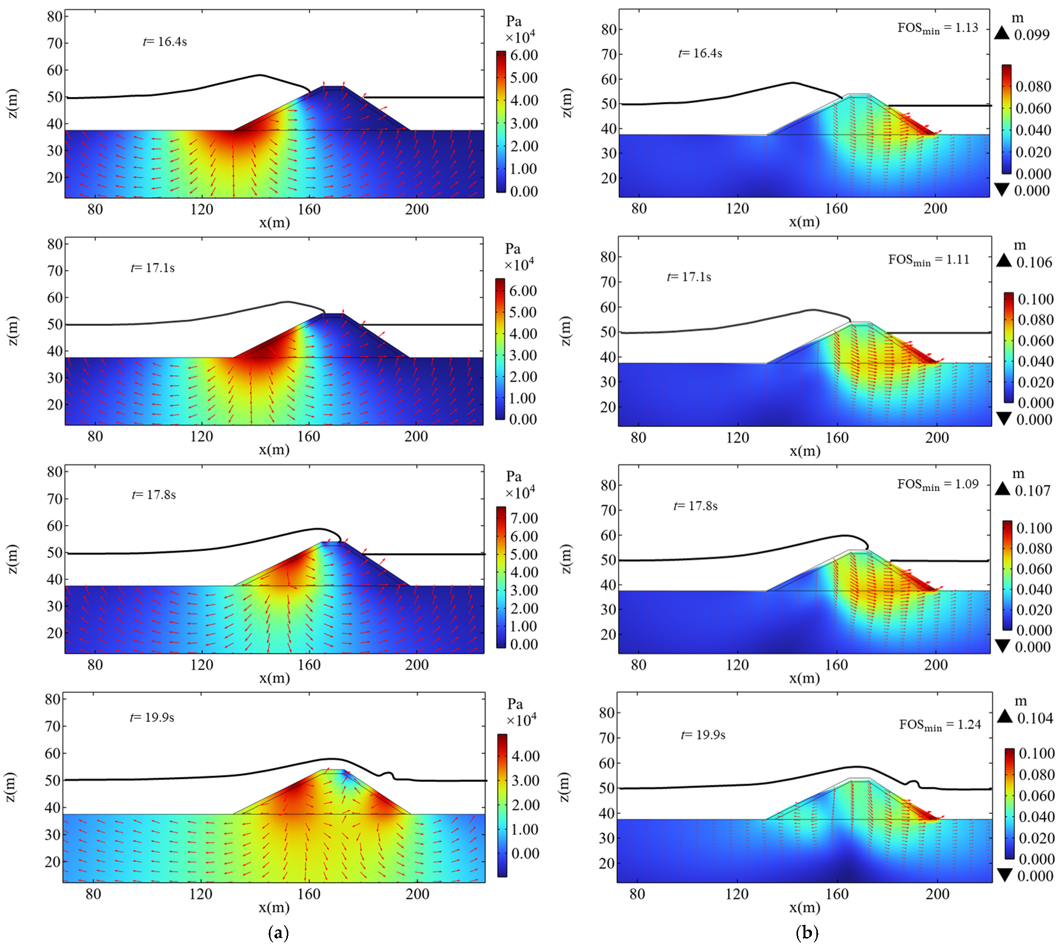 t = 16 s~17.8 s), the value of FOS gradually decreases. When the waves reach the landward slope, there is a significant increase in FOS, even exceeding the conditions under static water. This indicates that the wave load applied to the landward slope contributes to the stability of the breakwater. Additionally, the moment corresponding to the minimum factor of stability (FOS
