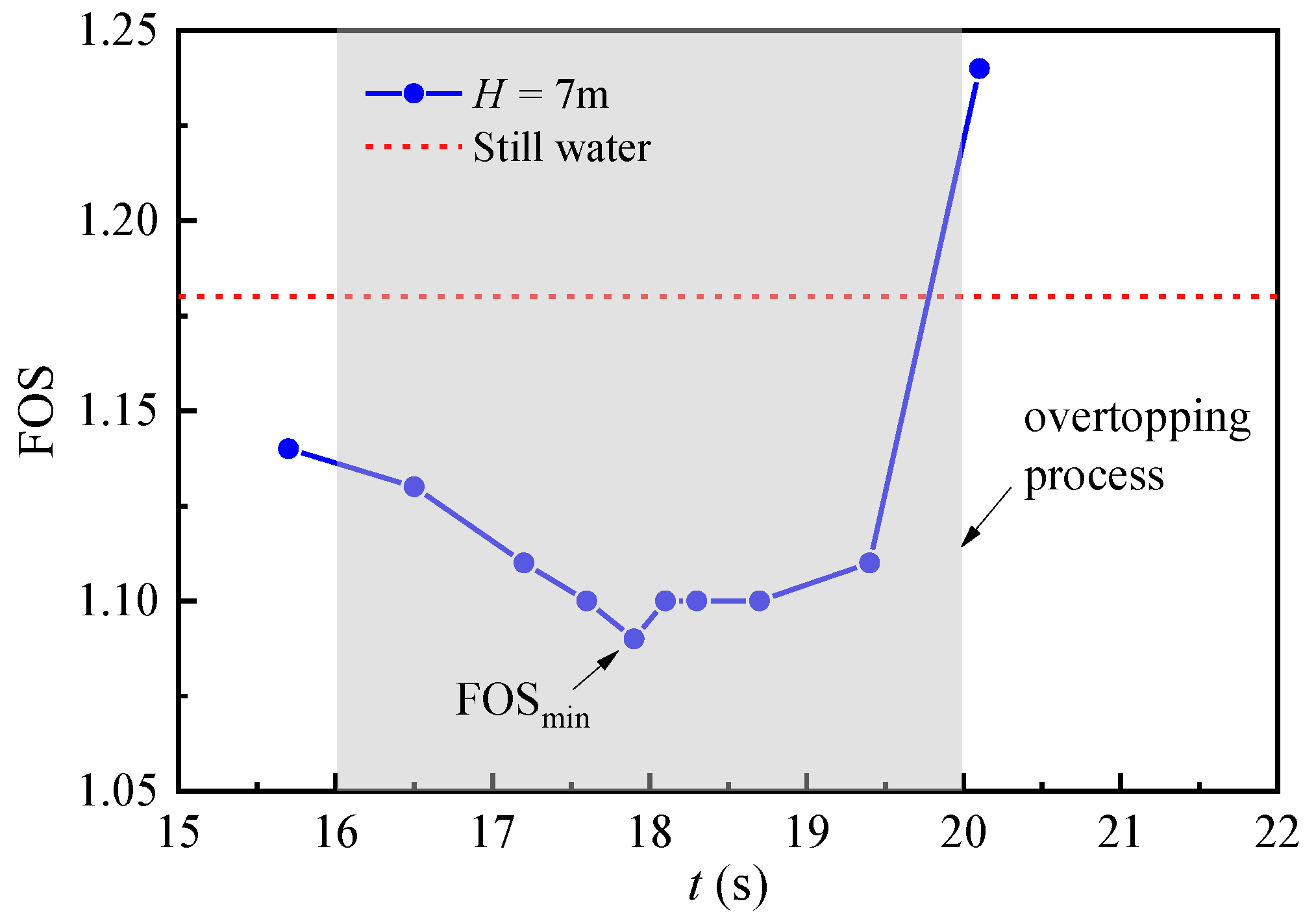 min) coincides with the moment when the wave crest approaches the crest of the seaward slope. This indicates that the breakwater is most prone to failure at this state. Therefore, FOS