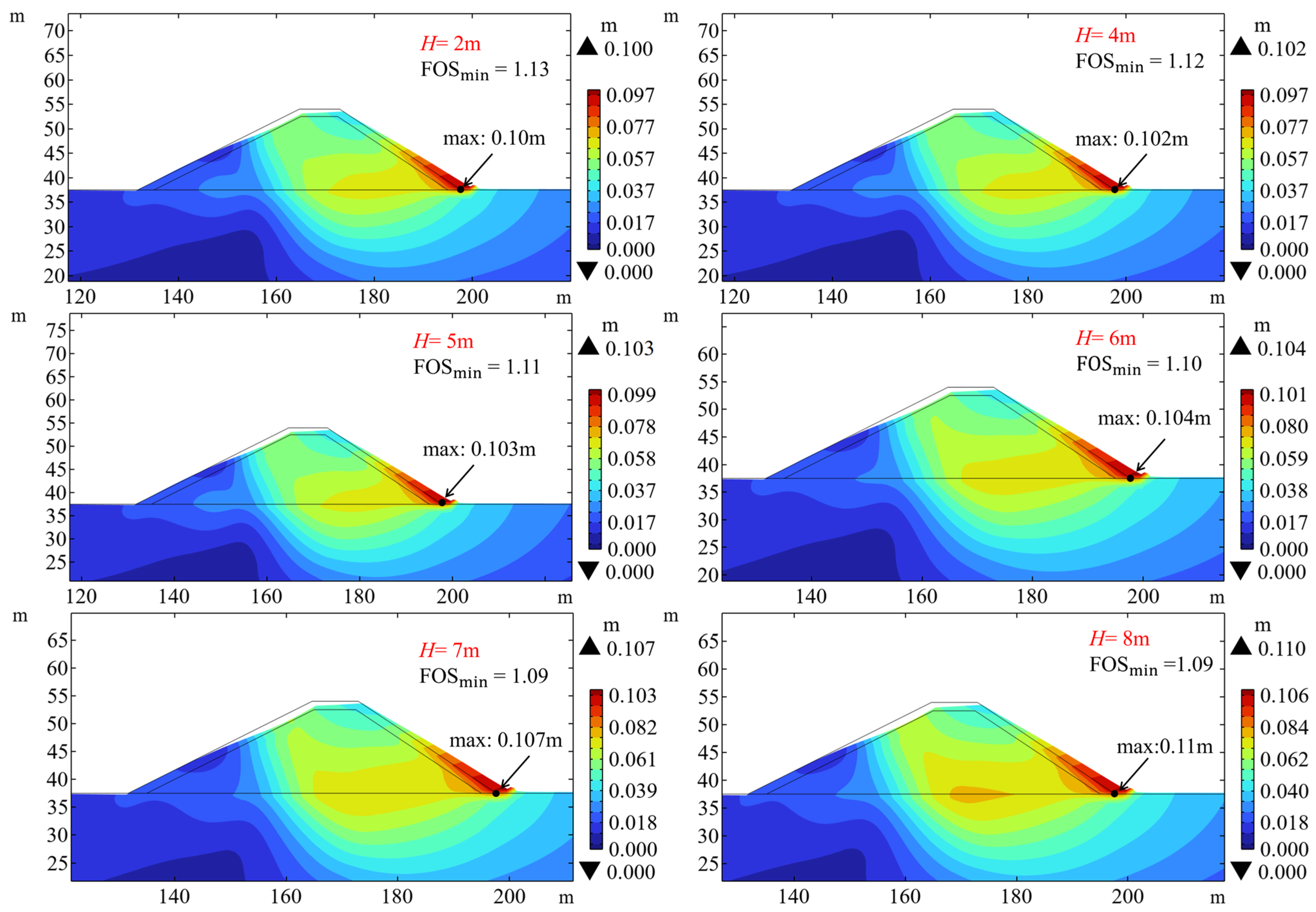 H = 2, 4, 5, 6, 7, and 8 m), with a maximum water depth of 12 m. It is shown that the maximum displacement near the foot of the slope increases with the increasing wave height. When the wave height increases from 2 m to 8 m, the maximum displacement increases from 0.10 m to 0.11 m, while FOS