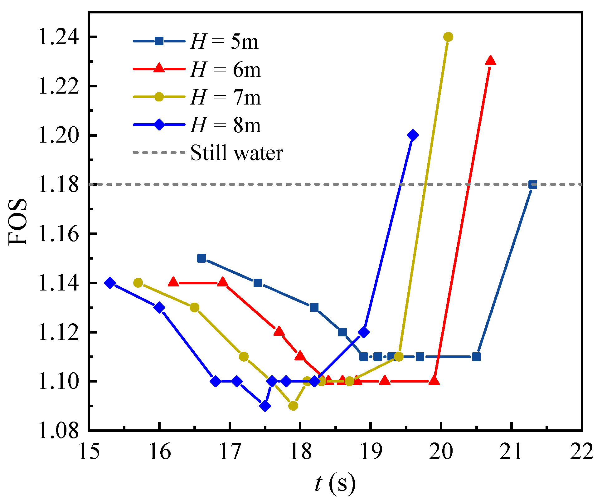 The temporal variations in FOS under different wave heights and back wave slopes are illustrated in