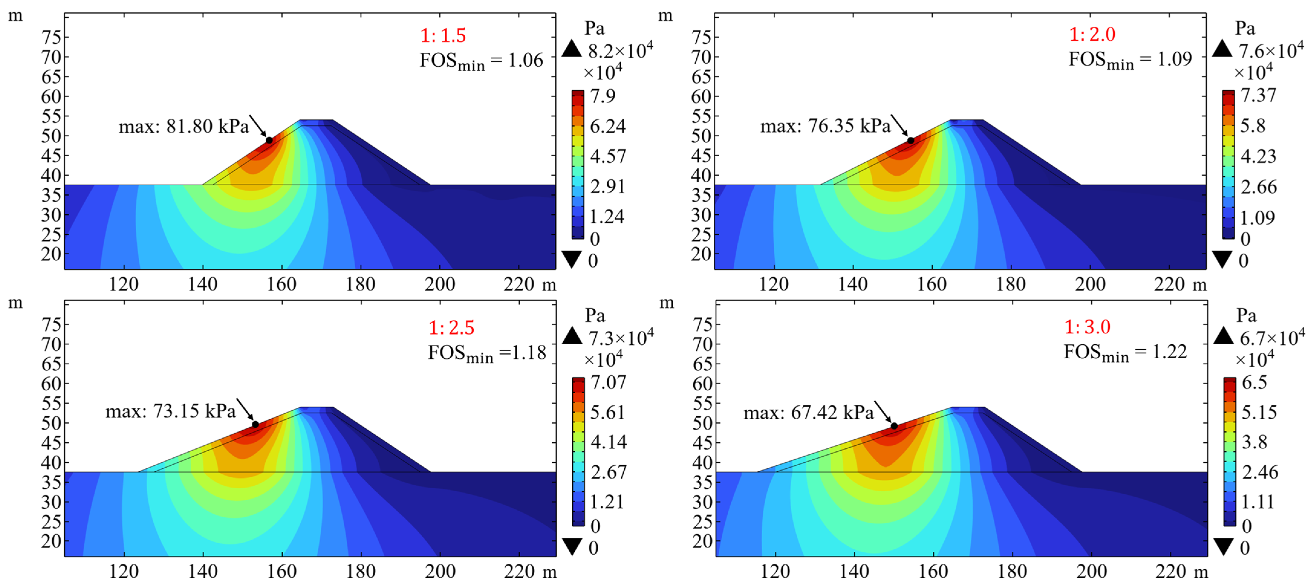 min exceed conventional engineering design requirements (>1.5 for the terrestrial slopes) when both seaward and landward slopes maintain gradients of 1:2 or flatter. This finding highlights the critical relationship between slope geometry and coastal structure stability under hydrodynamic forcing.