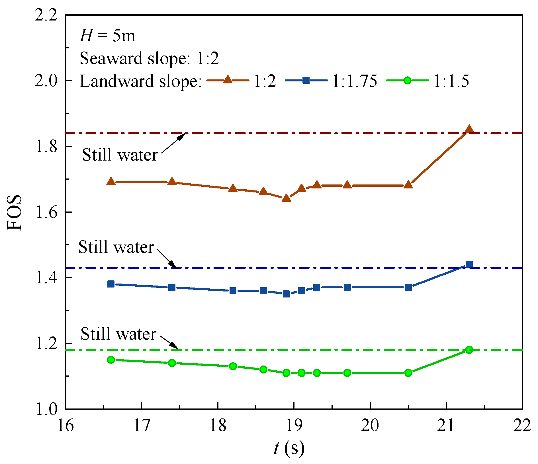 Figure 16 presents the temporal variations in FOS under different landward-slope gradients, with a constant wave height of 5 m. Three gradients of landward slope are examined: 1:1.5, 1:1.75, and 1.2. The FOS