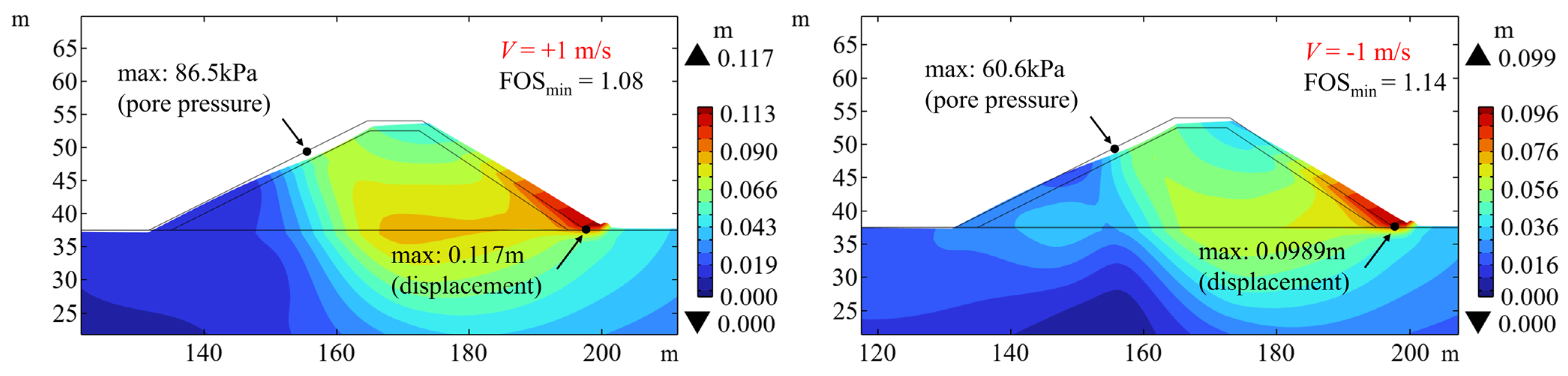 Figure 21 illustrate the displacement distribution at the most critical state when the berms of different heights are installed on the seaward slope and landward slope, respectively. It can be observed that placing the berm on either side of the breakwater increases the value of the FOS