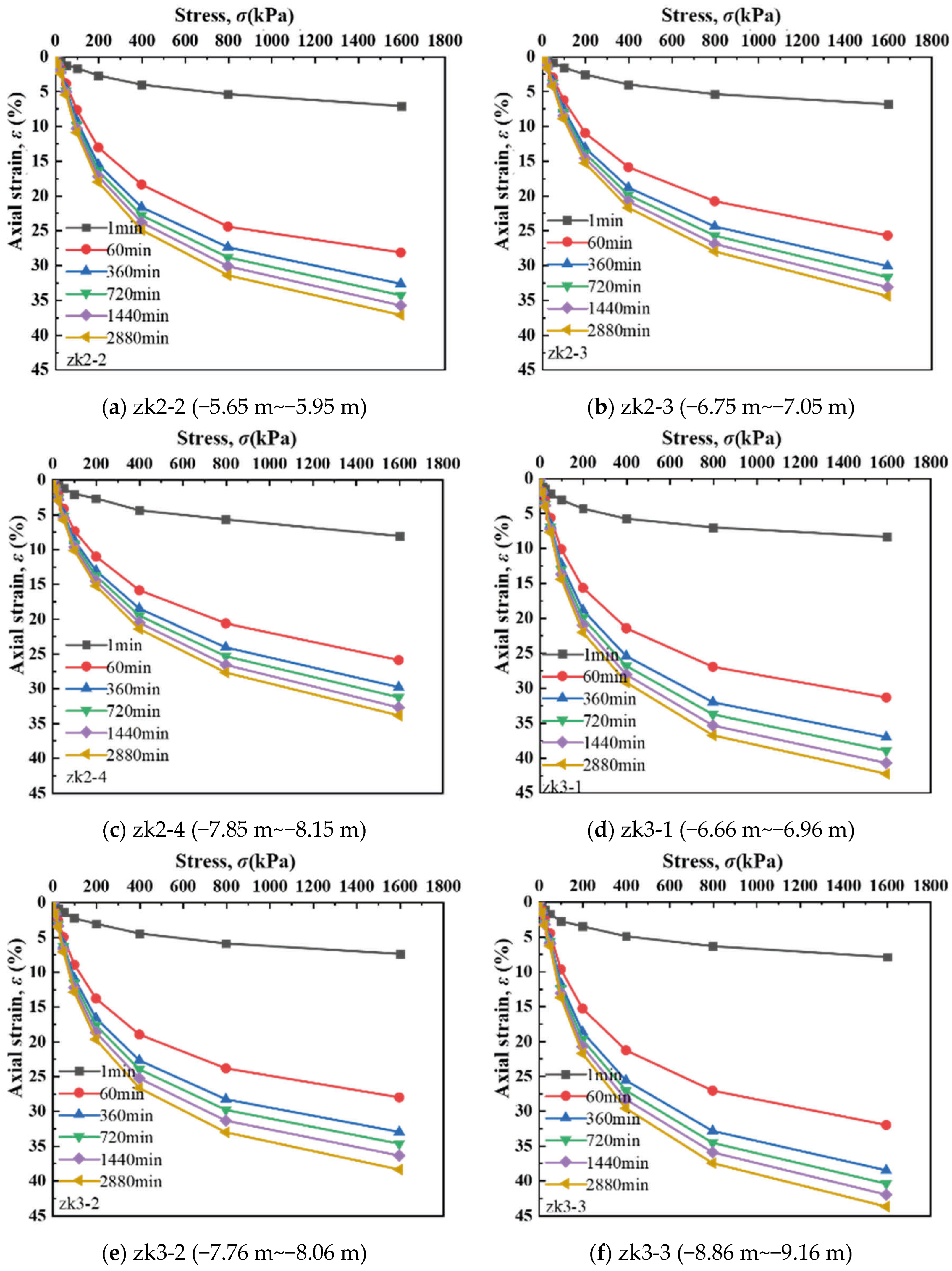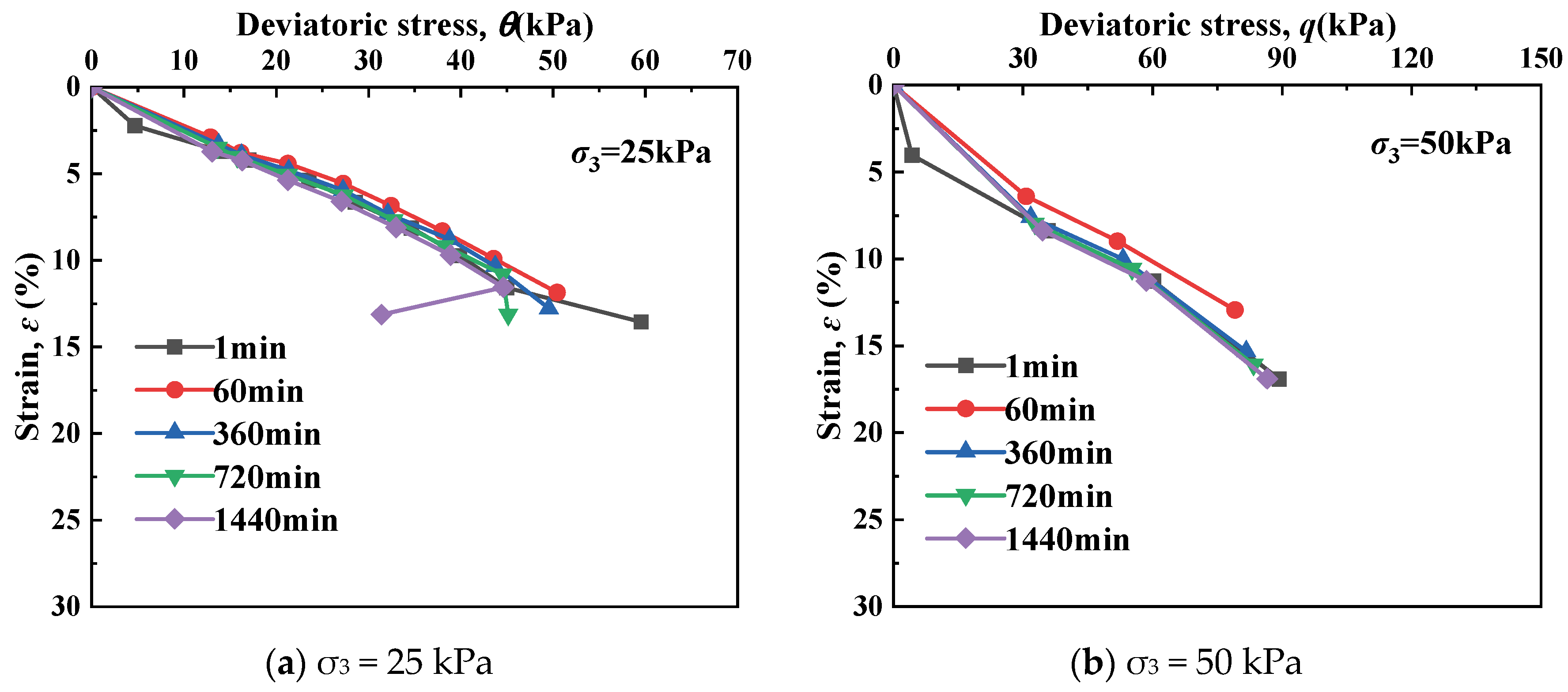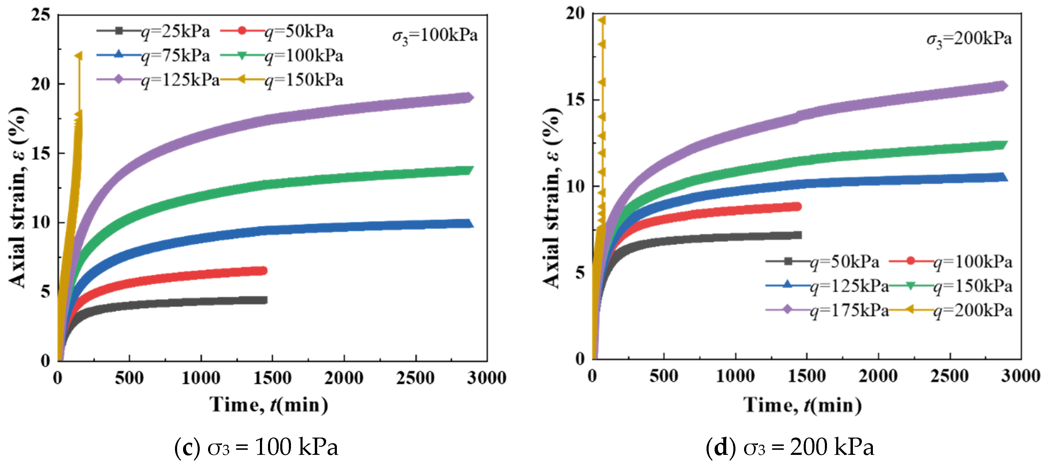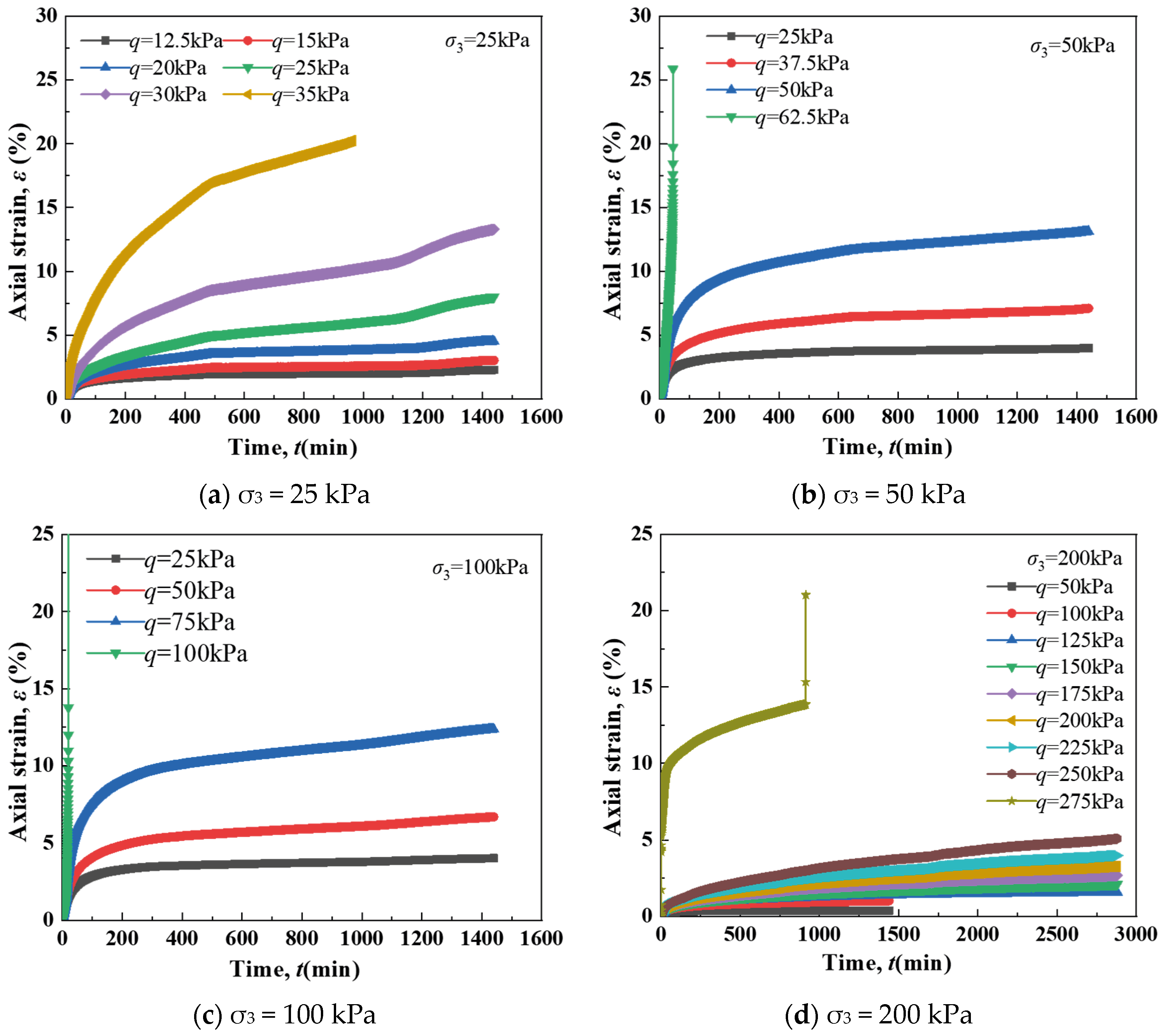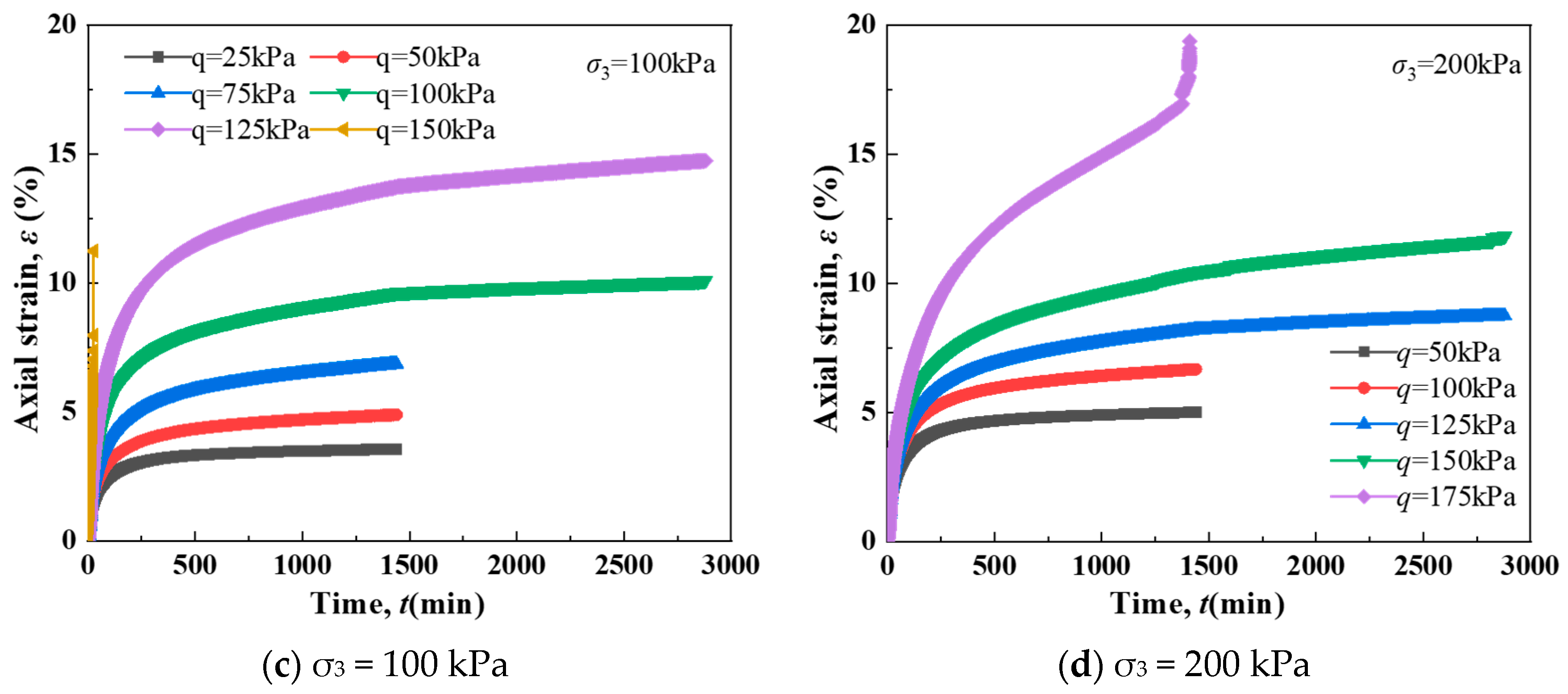 - Yang, A.-W.; Zhang, Z.-J.; Kong, L.-W. Experimental Study of Creep Property of Soft Clay under Different Stress Conditions. Rock Soil Mech. 2014, 35, 53–60. [Google Scholar]