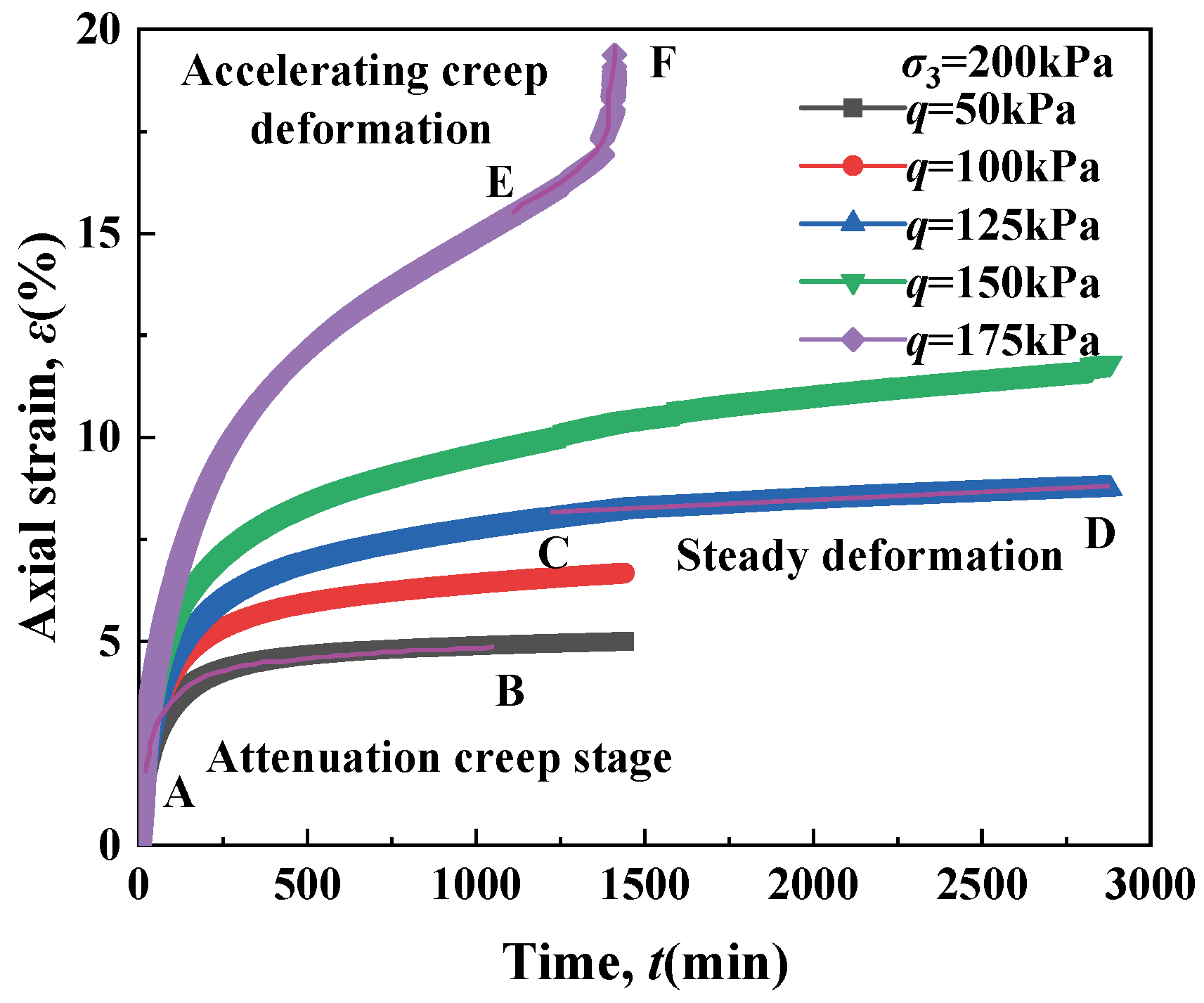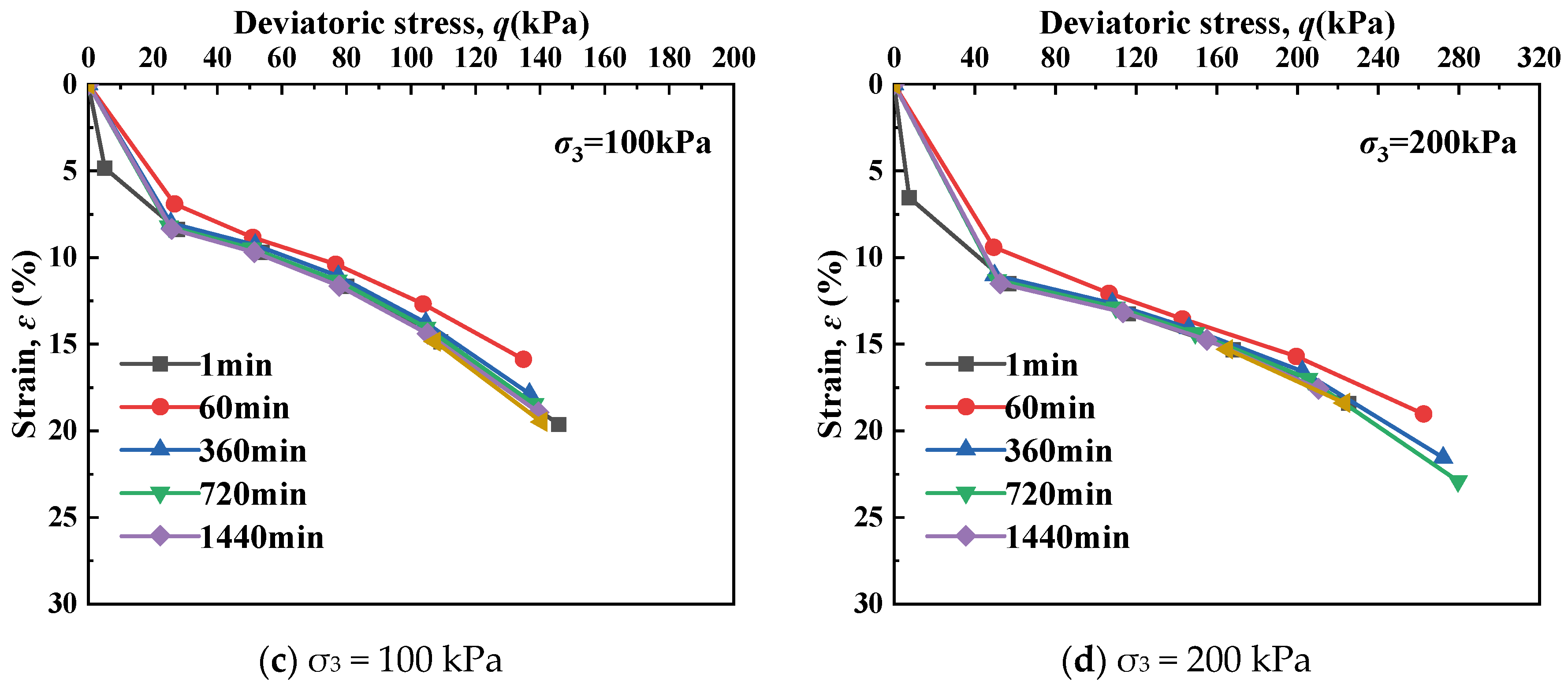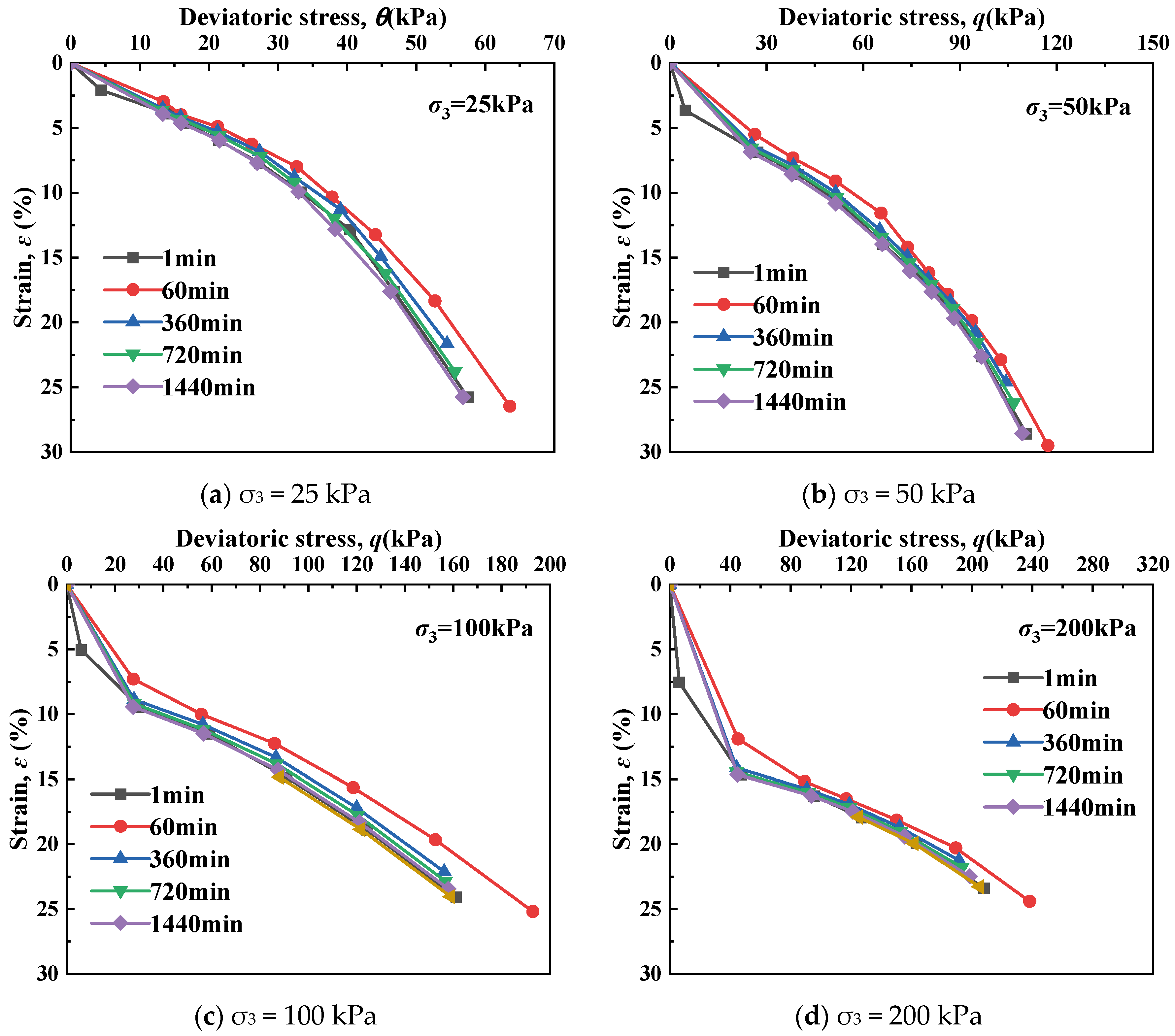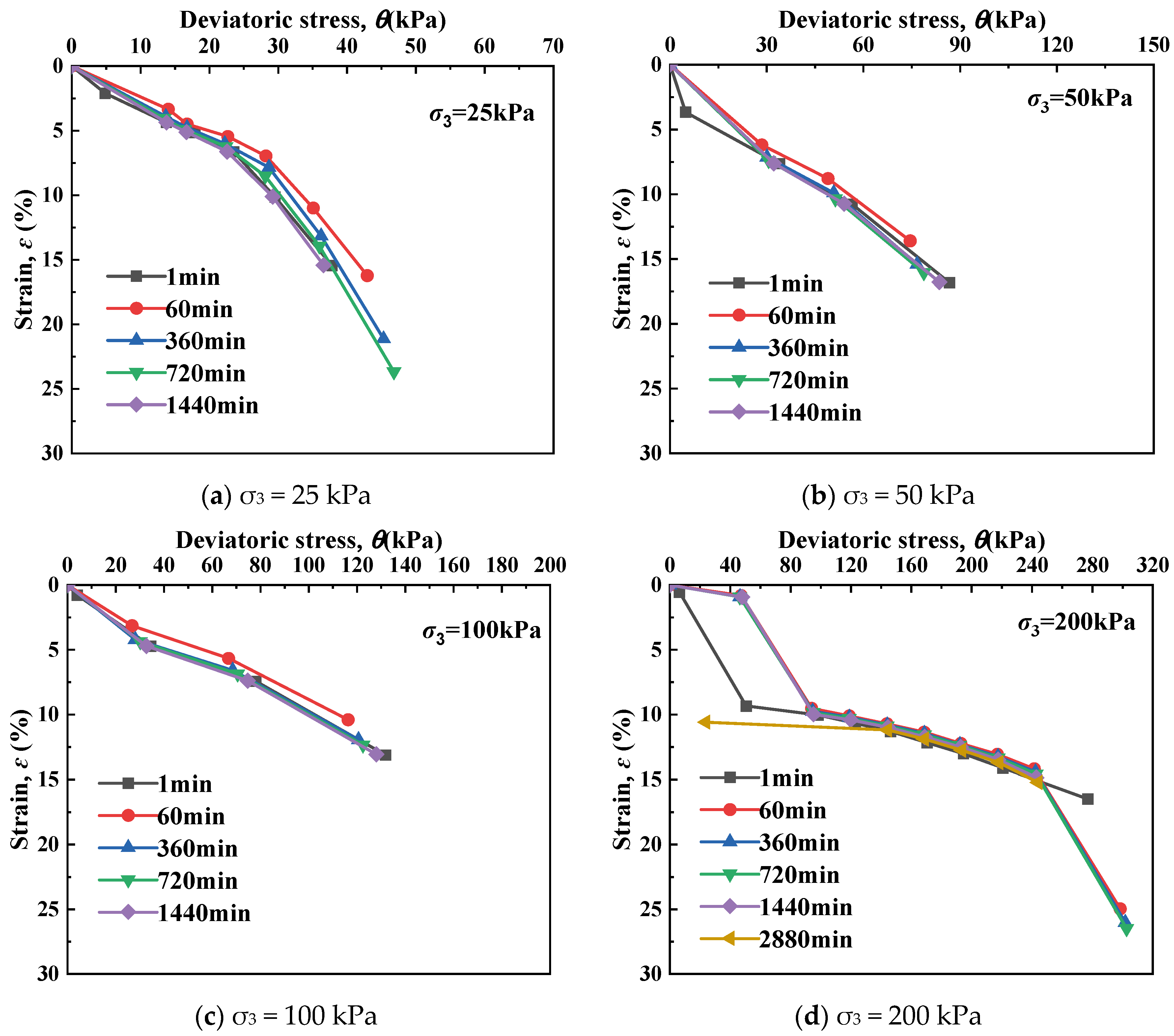 Soil | Confining Pressure σ3 (kPa) | Axial Stress σ1 (kPa) | Axial Deviatoric Stress q (kPa) | Each Level of Time (d) |