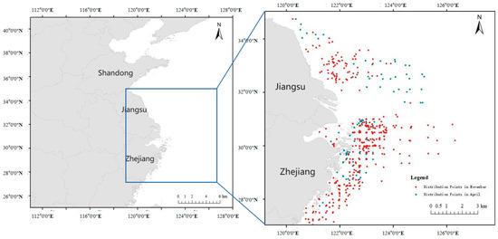 - Wang, Y.; Wang, J.; Zhou, Y. Spatial and temporal distribution characteristics of Larimichthys polyactis in Zhoushan fishing ground and the adjacent waters based on two-stage GAM. J. Fish. Sci. China 2022, 29, 633–641. (In Chinese) [Google Scholar]