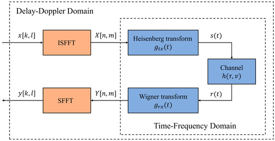 During the transmitter modulation process, the DD-domain signal undergoes a two-dimensional Inverse Symplectic Finite Fourier Transform (ISFFT) to convert it into a time-frequency domain signal. Each data symbol represents a point in the th Doppler and th delay dimensions, corresponding to the OTFS grid :