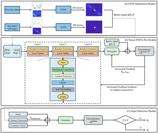 After OTFS modulation, the processed signal is mapped to the DD domain, thereby enhancing its sparsity. Subsequently, the sparse signal passes through the Tensor-FISTA-Net module, which applies FISTA to perform multi-layer unfolding, executing residual estimation and layer updates. The sparse signal is continuously optimized through momentum calculation, gradient projection, and soft thresholding. Concurrently, CBAM is introduced to help the model focus on key spatial and channel features, thereby improving object detection performance. After signal processing, the generator optimizes the sparse estimates within the GAN framework. The discriminator then compares the generated sparse signals with real samples using the WGAN-GP loss function. Discriminator feedback updates generator parameters to further refine sparse signal estimation accuracy. Simultaneously, discriminator parameters are updated based on adversarial gradients, enhancing its ability to distinguish real from generated signals. This adversarial process ensures robustness in sparse recovery and improves the model’s capability to detect small targets in complex maritime clutter environments.