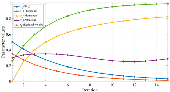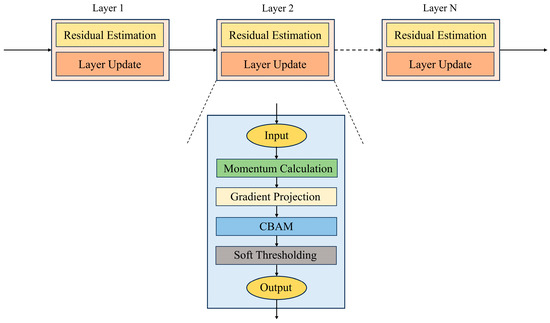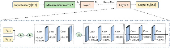 where denotes the number of unfolded layers, and represent the output spatial dimensions of the l-th layer in the generator, and denote the input and output channel counts of the generator, and is the kernel edge length. In this architecture, the parameters and in CBAM’s Formula (22) are replaced with and . The computational complexity of the momentum update component is , while that of the soft thresholding contraction component is also .