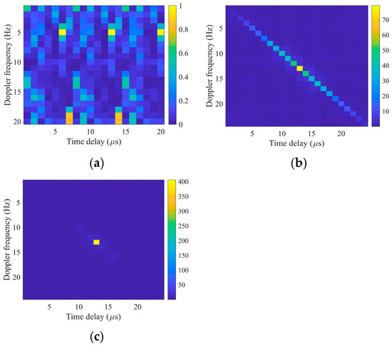Orthogonal Time-Frequency Space modulation is represented primarily in the delay-Doppler domain, making it well-suited for characterizing sparse structures in rapidly time-varying sea surface channels [15]. Compared to traditional time-frequency modulation, OTFS enhances the separability of target echoes and clutter by unfolding them in the DD domain, thereby improving weak small target detection. OTFS comprises three key stages: transmitter modulation, channel propagation, and receiver demodulation. Assuming each OTFS frame contains time symbols and frequency subcarriers, the system bandwidth is , and the frame duration is , where represents the duration of each symbol and is the subcarrier spacing, satisfying the orthogonality condition . Figure 1 shows the OTFS system flowchart. The specific steps are as follows:
