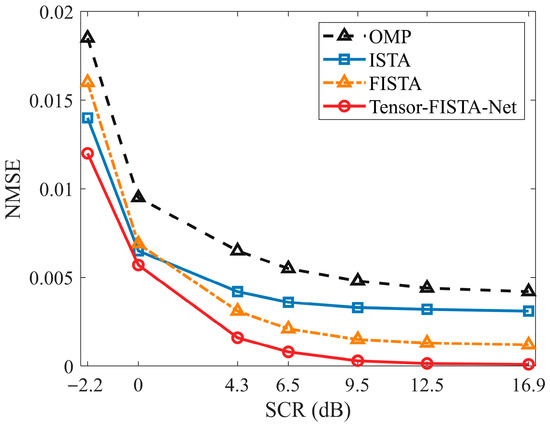 Scatter plots at different SCR levels. (a) OMP; (b) ISTA; (c) FISTA; (d) OTFS-FISTA-Net.