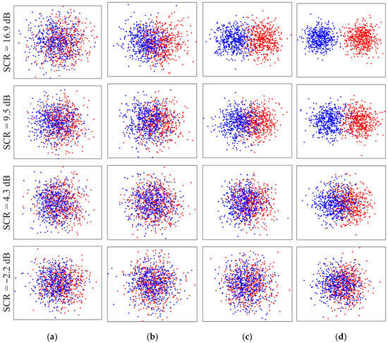 To validate the proposed method’s feature discrimination capability and visualization performance under varying SCR levels, Figure 12 displays the two-dimensional feature distribution maps extracted by the proposed method and three alternative approaches at four typical SCR levels. Each row corresponds to a fixed SCR level, presenting scatter plots from left to right for OMP, ISTA, FISTA, and OTFS-FISTA-Net, respectively. Red and blue points represent target and background features, respectively. These SCR values cover practical scenarios under high, medium, low, and extremely low signal-to-noise conditions, comprehensively reflecting how feature separability varies across methods under complex interference. The visualization reveals that feature separation progressively strengthens as SCR increases. Specifically, at , the feature distribution extracted by the OTFS-FISTA-Net method exhibits the strongest separability, forming a distinct boundary between the two classes. Conversely, under low SNR conditions (), the class boundaries become indistinct for all methods, with the OMP method barely distinguishing target from background features. Comprehensive comparison reveals that the OTFS-FISTA-Net method demonstrates more stable clustering structures and feature separation capabilities across different SCR levels.