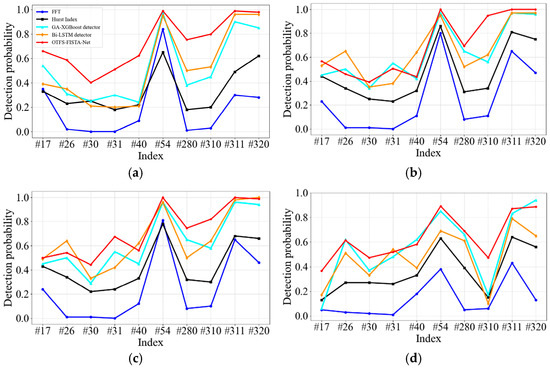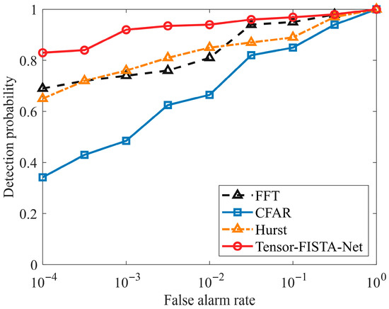 To validate the detection performance of the proposed algorithm, OTFS-FISTA-Net was compared with four other detection methods. Figure 16 shows the detection performance results of the five methods under four polarization conditions. The other four methods are the Fourier Transform, the Hurst Index, the GA-XGBoost detector [30], and the Bi-LSTM detector [31]. The observation time was set to 1.024 s, with a false alarm rate . As shown in Figure 10, under identical conditions, the average detection probabilities for the five methods were 20.53%, 43.53%, 70.75%, 84.25%, and 88.56%, respectively. It is evident that OTFS-FISTA-Net significantly outperforms other methods, maintaining high detection performance even under low-to-medium signal-to-noise ratios and highly sparse targets. This advantage stems primarily from its integration of tensor modeling and attention mechanisms, which effectively enhance the network’s ability to focus on and express key regional features, thereby improving target-background discrimination.