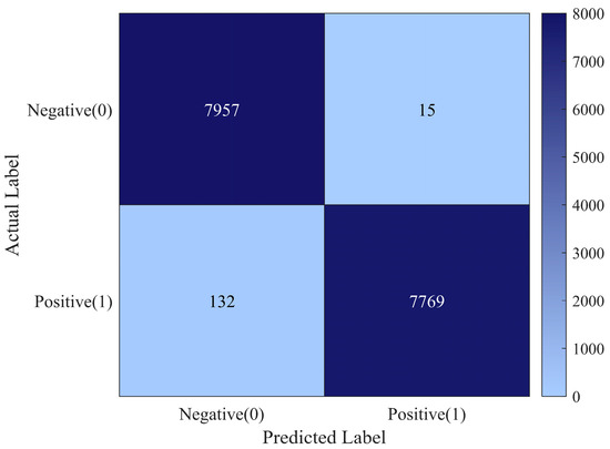 Further analysis reveals that the number of iteration layers in the network also significantly impacts detection performance. As shown in Figure 14, selecting dataset #54 with a false alarm rate of . For three scenarios with 6, 12, and 15 iterations, Tensor-FISTA-Net achieved average detection probabilities of 64.49%, 81.34%, and 96.31%, respectively. This yields two key conclusions. First, increasing iterations enhances the deep unfolding network’s ability to represent nonlinear mappings, improves sparse feature representation, and consequently boosts detection probability. Second, with fewer layers, the network’s fitting capability is insufficient, making it difficult for the model to capture complete structural features and limiting detection performance. Therefore, under a reasonable number of layers, Tensor-FISTA-Net achieves high-precision, high-robustness weak object detection by deeply unfolding the FISTA optimization process and integrating key modules. Under the same conditions, confusion matrices were calculated for 20 datasets, as shown in Figure 15. Among the test images, 7957 images were correctly classified as without target, while 15 images were incorrectly classified as containing targets. Conversely, 132 images were incorrectly classified as without a target, and 7769 images were correctly classified as containing targets. Calculated from this confusion matrix, OTFS-FISTA-Net achieves an overall detection accuracy of 98.97%.