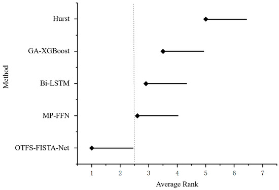 where denotes the average rank of the -th algorithm. Should Friedman’s test reject the null hypothesis that ‘all algorithms perform identically’, the Nemenyi test is subsequently employed for pairwise comparisons to identify algorithms exhibiting significant differences. The critical difference (CD) for the Nemenyi test is defined as: