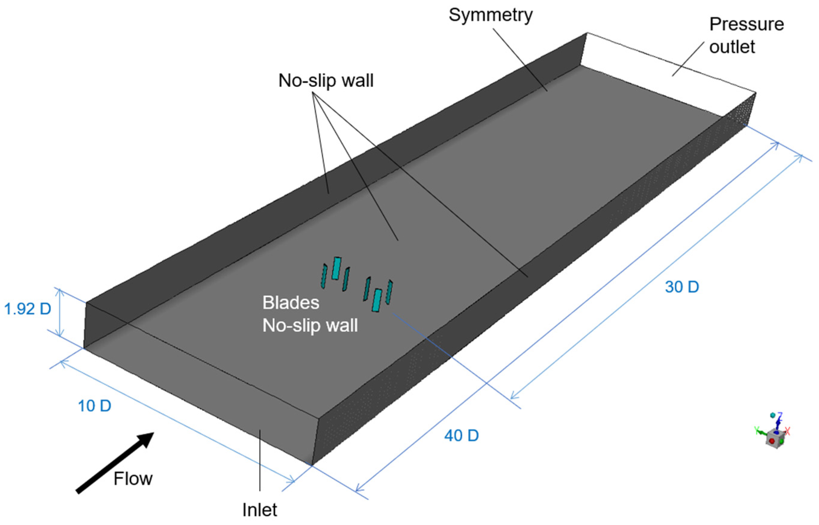 - The limitations of the present work are mainly associated with the symmetrical boundary conditions imposed at the flume free surface and with the turbulence model employed. To address cases with lower turbine immersion depths, proper modeling of free surface deformation is required (e.g., through VOF techniques). Likewise, high-fidelity simulations within the Large Eddy Simulation framework would provide a more detailed resolution of wake development. However, implementing both approaches would substantially increase the computational cost, and this challenge will be addressed in our future work.