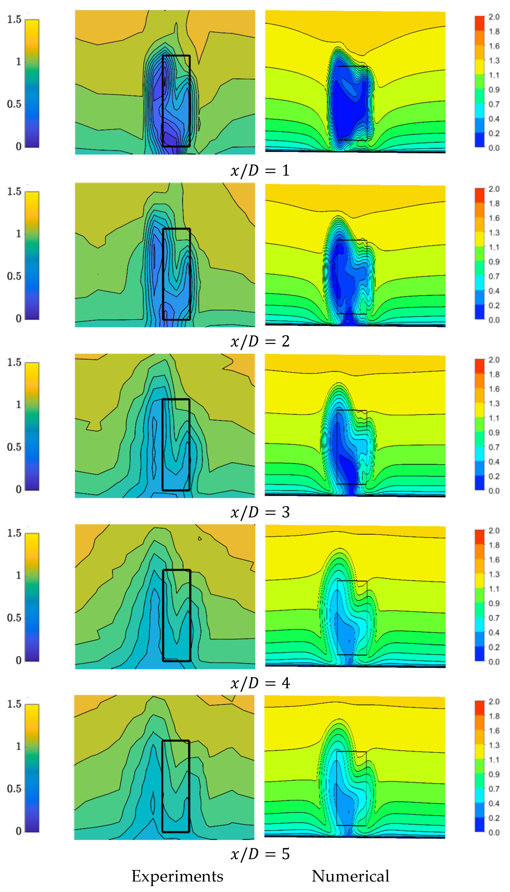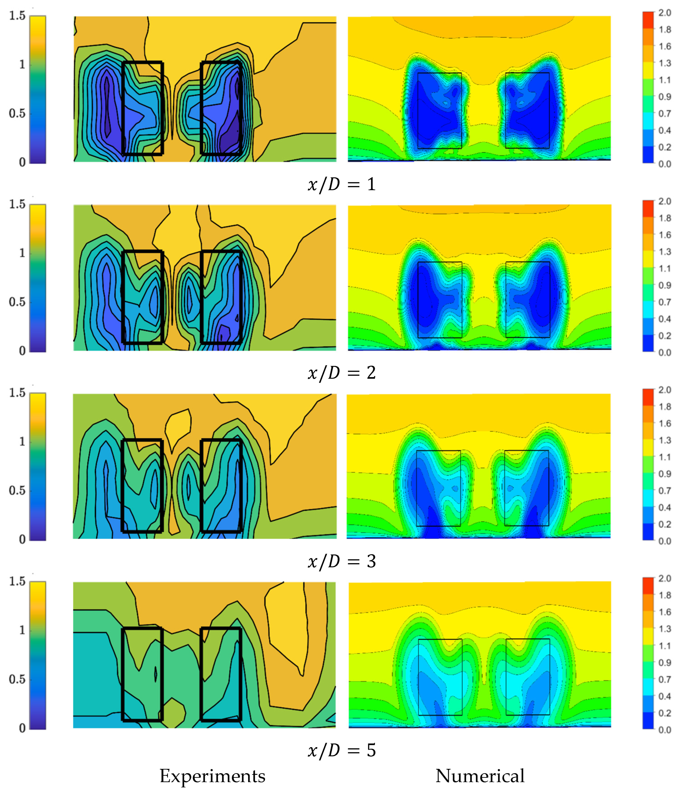- The simulations revealed predominantly symmetrical wake patterns behind the turbines in computational models, contrasting with experimental results which displayed certain asymmetries. However, despite this discrepancy, qualitative agreement was observed in wake evolution and velocity deficits, especially for the flow regions in proximity to the turbines. The experimental wakes showed earlier wake mixing and faster recovery than simulations predicted, likely due to measurement restrictions and flow perturbations not captured in the numerical models.