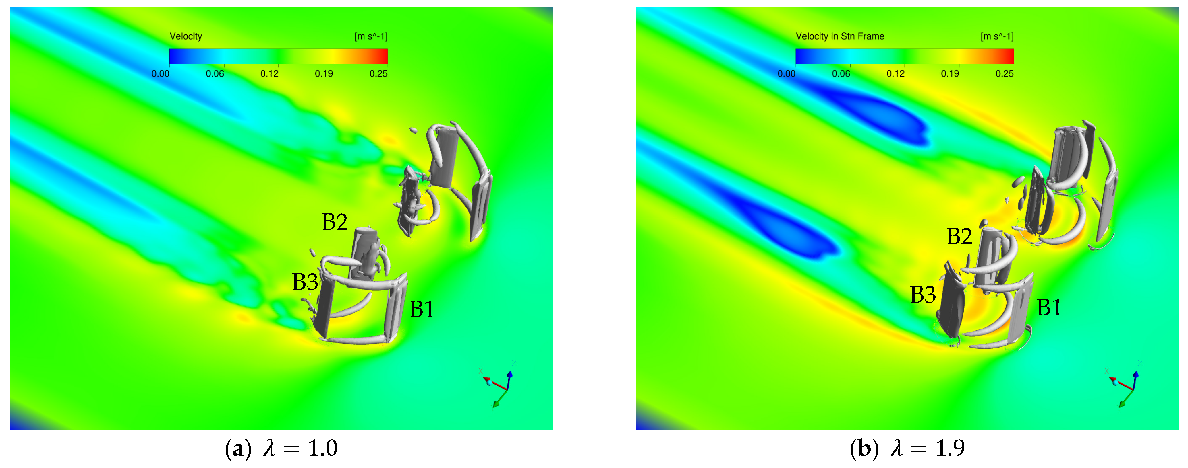 - Morales-Ramirez, C.M.; Benavides-Morán, A.; López-Mejía, O.D. Integrated overset mesh and volume of fluid method for modeling free-surface dynamics in vertical axis hydrokinetic turbines at low Reynolds numbers. Phys. Fluids 2025, 37, 037106. [Google Scholar] [CrossRef]